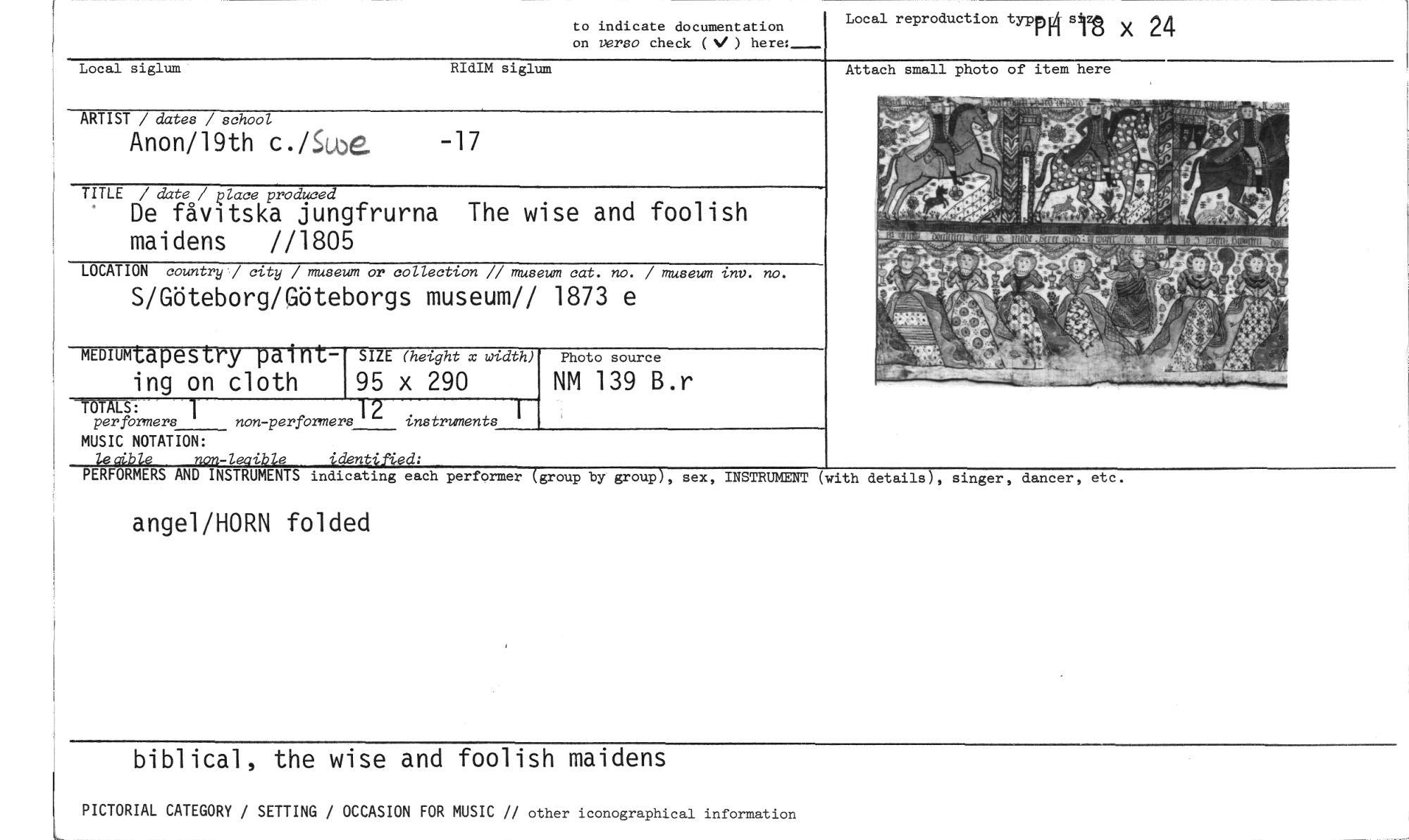//// to indicate documentation //// on versa check (%1 ) here:___ //// Local reproduction ty-pr14 alls x 24 //// delL : //// ,ffiergianiehrile«Tar~ar-Walff ana kerglarqingn7ral, //// ARTIST / dates / school //// Anon/19th c./Suy• -17 //// TITLE / date / place produced //// De fåvitska jungfrurna The wise and foolish maidens //1805 //// LOCATION country / city / museum or collection // museum cat. no. / museum inv. no. //// S/Göteborg/Göteborgs museum// 1873 e //// IZE (height x width) //// 95 x 290 //// per forme rs non-perfOrmers instruments //// MUSIC NOTATION: //// lecible non-legible identijied: //// ing on cloth //// TOTAL: 1 12 //// EDI .1 es //// Photo source //// NM 139 B.r //// Attach small photo of item here //// Local siglum RIdIM siglum //// PERFORMERS AND INSTRUMENTS indicating each performer-rgroup by group), sex, INSTRUMENT (with details), singer, dancer, etc. //// angel/HORN folded //// biblical, the wise and foolish maidens //// PICTORIAL CATEGORY / SETTING / OCCASION FOR MUSIC // other iconographical information ////