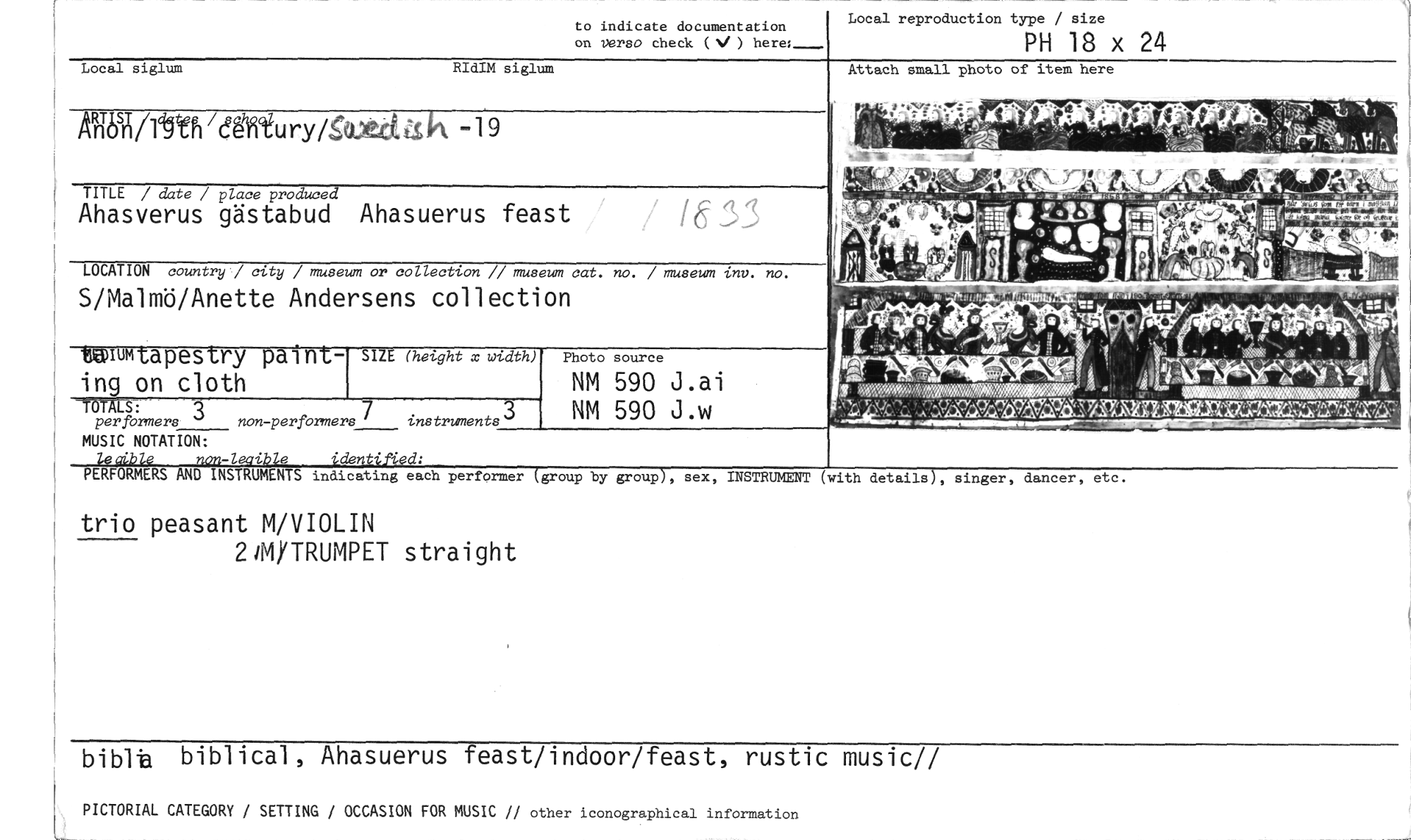 //// trio peasant M/VIOLIN //// 24M/TRUMPET straight //// biblig biblical, Ahasuerus feast/indoor/feast, rustic music// //// PICTORIAL CATEGORY / SETTING OCCASION FOR MUSIC // other iconographical information //// PH 18 x 24 //// to indicate documentation Local reproduction type / size //// on verso check (N/ ) here; //// RIdIM siglum Attach small photo of item here //// Local siglum //// AN6srVidgtfi /egfitu ry /pk.ett SI1 -19 //// TITLE / date / place produced //// Ahasverus gästabud Ahasuerus feast //// LOCATION country / city / museum or collection // museum cat. no. / museum inv. no. //// S/Malmö/Anette Andersens collection //// mumtapestry paint- //// ing on cloth //// -TÖMS: //// per formers non-performers 7 //// 2 instruments //// MUSIC NOTATION: //// .4-1- i. e 'dån '-d: //// PERFORMERS AND INSTRUMENTS indicating each performer //// SIZE (height x width) //// group by group , sex, INSTRUMENT (with details), singer, dancer, et //// ,ww w //// TåSP : //// ti p(t1P ; • //// Photo source //// NM 590 J.ai NM 590 J.w //// `rir-10~~51 //// I //// 4,444444~~memeW-- 'imemeememeneemenemew ' //// 7Arritiuu ////