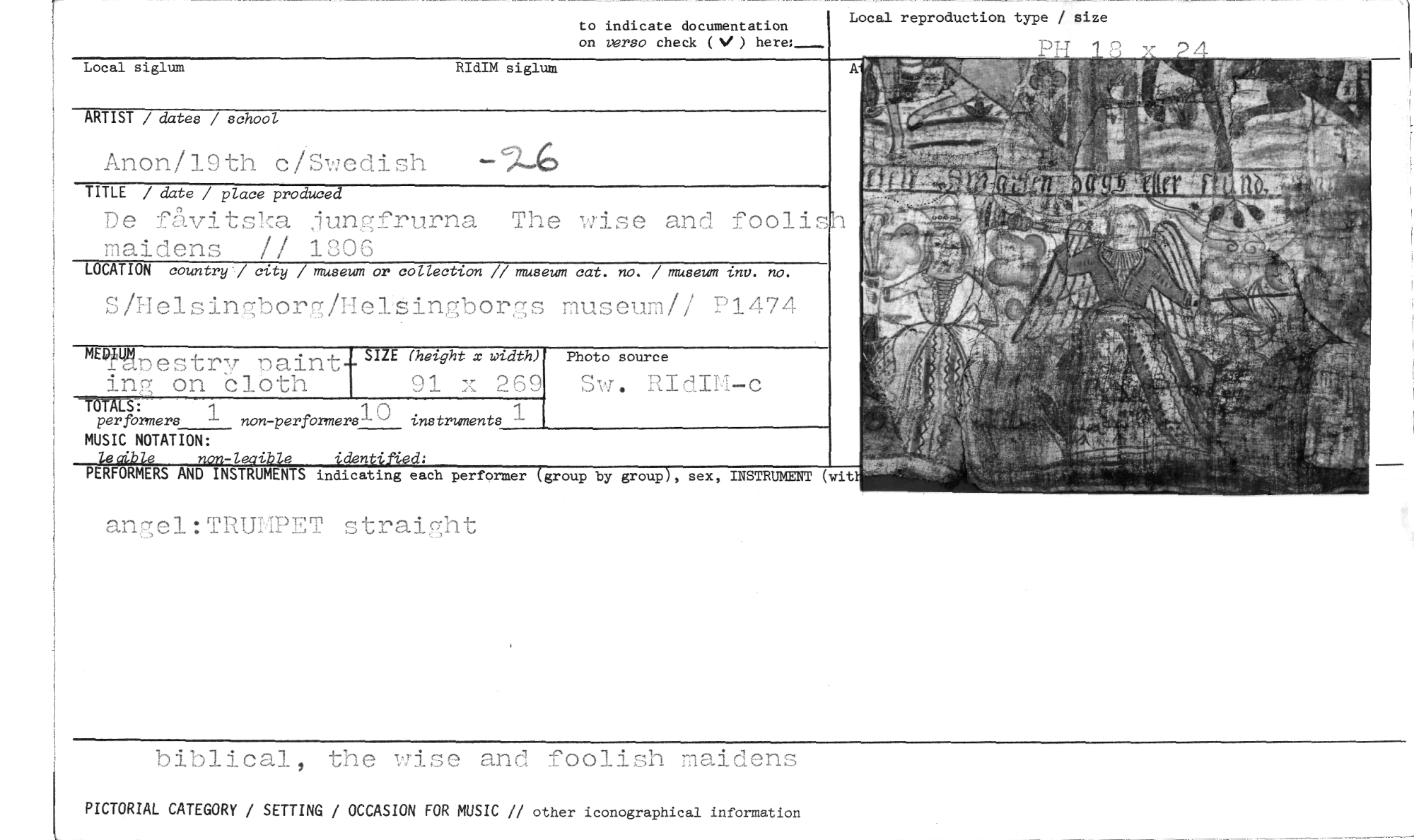 //// to indicate documentation //// on verso check (V ) here:_— //// Local reproduction type / size //// )TJ //// 74; //// Local siglum RIdIM siglum //// ARTIST / datas / school //// Anon/19th c/Swedish //// TITLE / date / place produced //// De fåvitska jungfrurna The wdse and foolis maidens // 1306 //// LOCATION country / city / museum or collection /7 museum cat. no. / museum inv. no. //// S/Helsingborg/Helsingborrr,s museum// P1474 //// num //// u.unestry naint-SIZE (height x width) Photo source //// in7 on clöth 91 x 269 Sw. RIdIM -c //// TOTALS: //// per formers non-performers1C) //// i instruments 1 //// MUSIC NOTATION: //// Zsaible non-leaible identified: //// PERFORMERS AND INSTRUMENTS indicating each performer (group by group), sex, INSTRUMENT (vit //// angel:TRUMPET strai ht //// biblical, the vise and foolish maidens //// PICTORIAL CATEGORY / SETTING / OCCASION FOR MUSIC // other iconographicai information ////