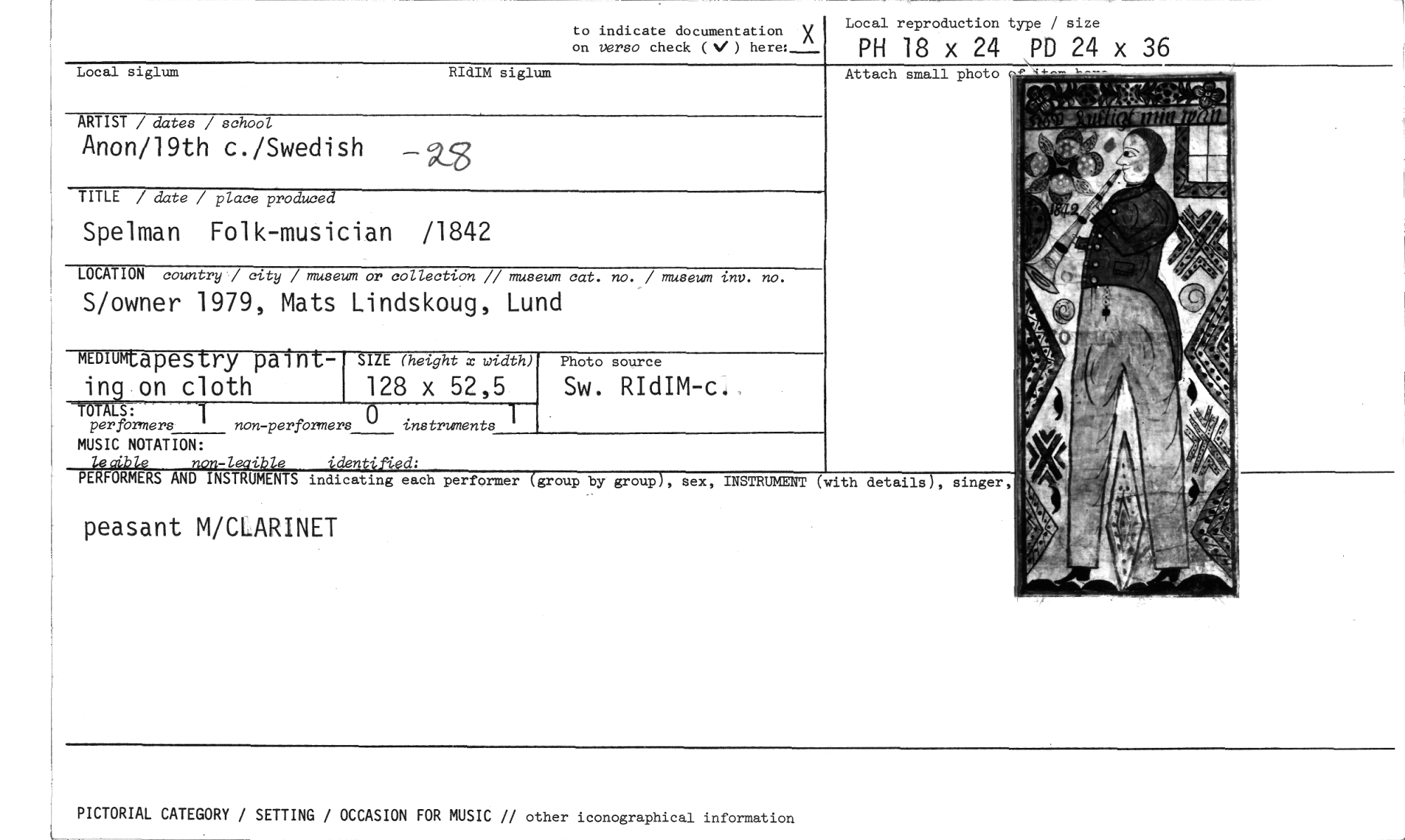 //// to indicate documentation X on verso check ( here:_ //// Local reproduction type / size //// PH 18 x 24 PD 24 x 36 //// Local siglum RIdIM siglum //// ARTIST / dates / school //// Anon/19th c./Swedish //// TITLE / date / place produced //// Spelman Folk-musician /1842 //// LOCATION country / city / museum or collection // museum cat. no. / museum inv. no. //// S/owner 1979, Mats Lindskoug, Lund //// MEDIUMt apestry paint- //// in on cloth //// LS: //// per formers non-performers instruments //// MUSIC NOTATION: //// le alble non-leaible identified: //// PERFORMERS AND INSTRUMENTS indicating each performer (group by group), sex, INSTRUMENT (with details), singer, //// peasant M/CLARINET //// Attach small photo //// SIZE (height x width) //// 128 x 52,5 //// Photo source //// Sw. RIdIM- //// PICTORIAL CATEGORY / SETTING / OCCASION FOR MUSIC // other iconographical information ////