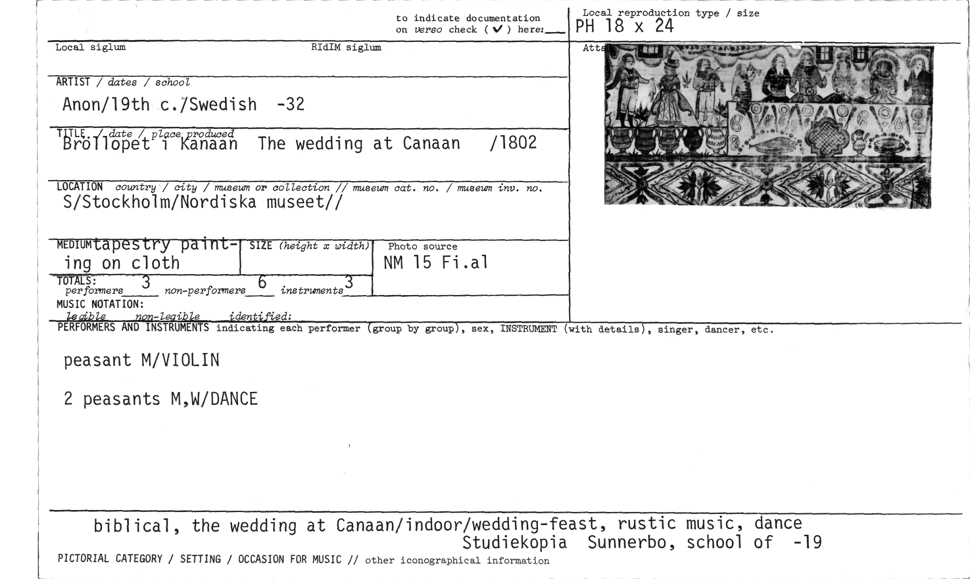 //// peasant M/VIOLIN //// 2 peasants M,W/DANCE //// biblical, the wedding at Canaan/indoor/wedding-feast, rustic music, dance //// Studiekopia Sunnerbo, school of -19 //// PICTORIAL CATEGORY / SETTING / OCCASION FOR MUSIC // other iconographical information //// to indicate documentation //// on versa check (s, ) here:_ //// Local siglum RIdIM siglum //// ARTIST / dates / school //// Anon/19th c./Swedish -32 //// TLTLE.../ date / place. roduced //// BroIlopet 1 Kanaan The wedding at Canaan /1802 //// LOCATION country / city / museum or collection // museum cat. no. / museum inv. no, //// S/Stockholm/Nordiska museet// //// Local reproduction type / size //// PH 18 x 24 //// MEDIUM tapestry paint- SIZE (height x width) //// ing on cloth //// TOTALS: //// perfbrmers 3 //// non-perförmers //// --B //// instruments //// Photo source //// NM 15 Fi.al //// MUSIC NOTATION: //// aible non-lecibie identified; //// PERFORMERS AND INSTRUMENTS indicating each performer (group by group), //// sex, INSTRUMENT (with details, singer, dancer, etc. ////