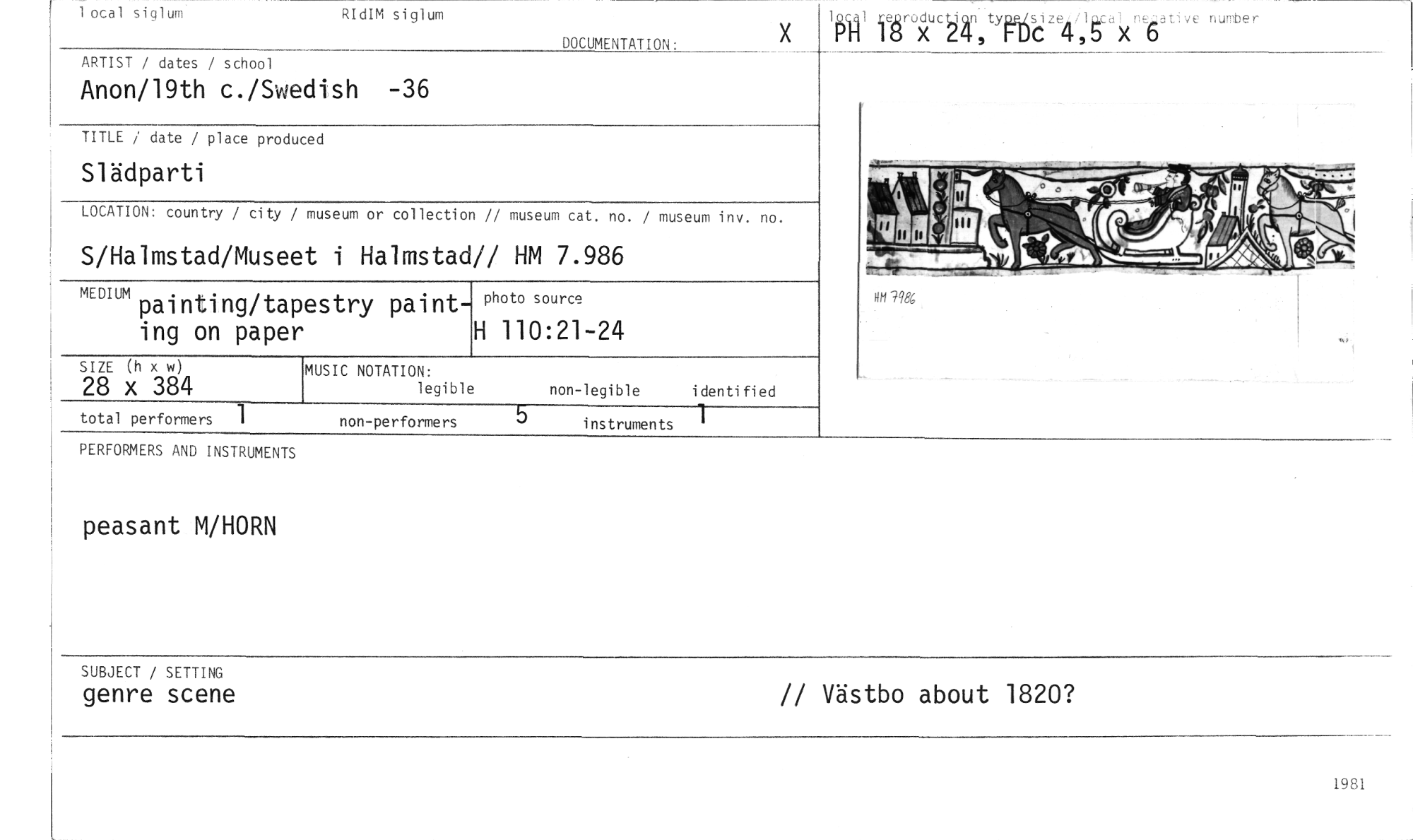 //// oca 1 siglum //// *.ve nurober //// RIdIM siglum //// reuroduction yntis //// 18 X 24, FDC 4 //// ARTIST / dates / school //// Anon/19th c./Swedish -36 //// DOCUMENTATION: //// TITLE / date / place produced //// Slädparti //// LOCATION: country / city / museum or collection // museum cat. no. / museum inv. no. //// S/Halmstad/Museet i Halmstad// HM 7.986 //// MEDIUM //// ef?986 //// photo source //// H 110:21-24 //// painting/tapestry painting on paper //// SIZE (h x w) //// 28 x 384 //// identified //// NOTATION: //// legible //// non-legible //// total performers //// non-performers //// instruments 1 //// PERFORMERS AND INSTRUMENTS //// peasant M/HORN //// SUBJECT / SETTING //// genre scene //// // Västbo about 1820? //// 1981 ////
