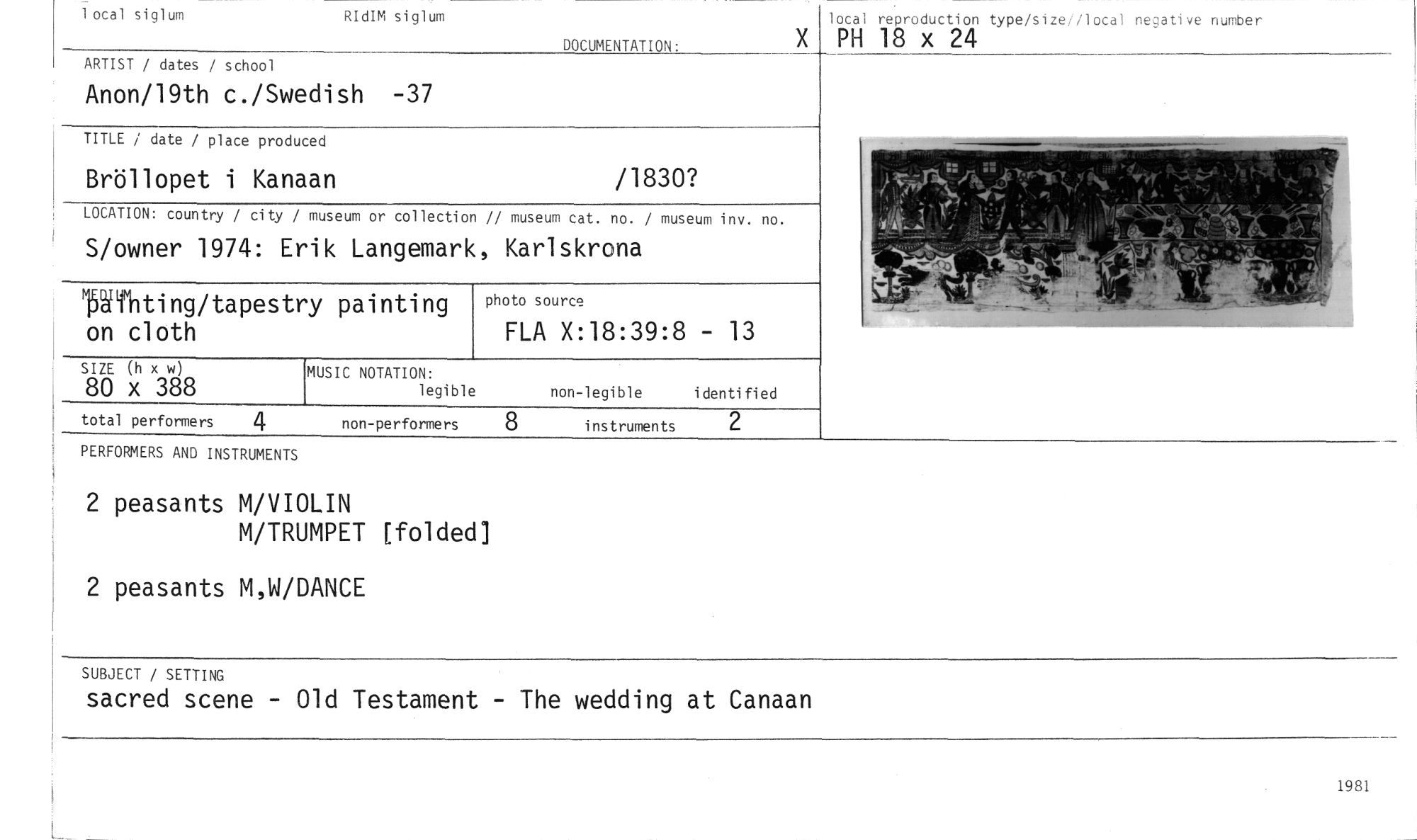 //// local siglum RIdIM siglum //// DOCUMENTATION: //// local reproduction type/size//local negative number //// X PH 18 x 24 //// ARTIST / dates / school //// Anon/19th c./Swedish -37 //// TITLE / date / place produced //// Bröllopet i Kanaan /1830? //// LOCATION: country / city / museum or collection // museum cat. no. / museum inv. no. //// S/owner 1974: Erik Langemark, Karlskrona //// Wfhting/tapestry painting on cloth photo source //// FLA X:18:39:8 - 13 //// //// //// //// SIZE (h x w) //// 80 x 388 //// MUSIC NOTATION: //// legible non-legible identified //// total performers 4 non-performers instruments 2 //// PERFORMERS AND INSTRUMENTS //// 2 peasants M/VIOLIN //// M/TRUMPET [folded] //// 2 peasants M,W/DANCE //// SUBJECT / SETTING //// sacred scene - Old Testament - The wedding at Canaan ////