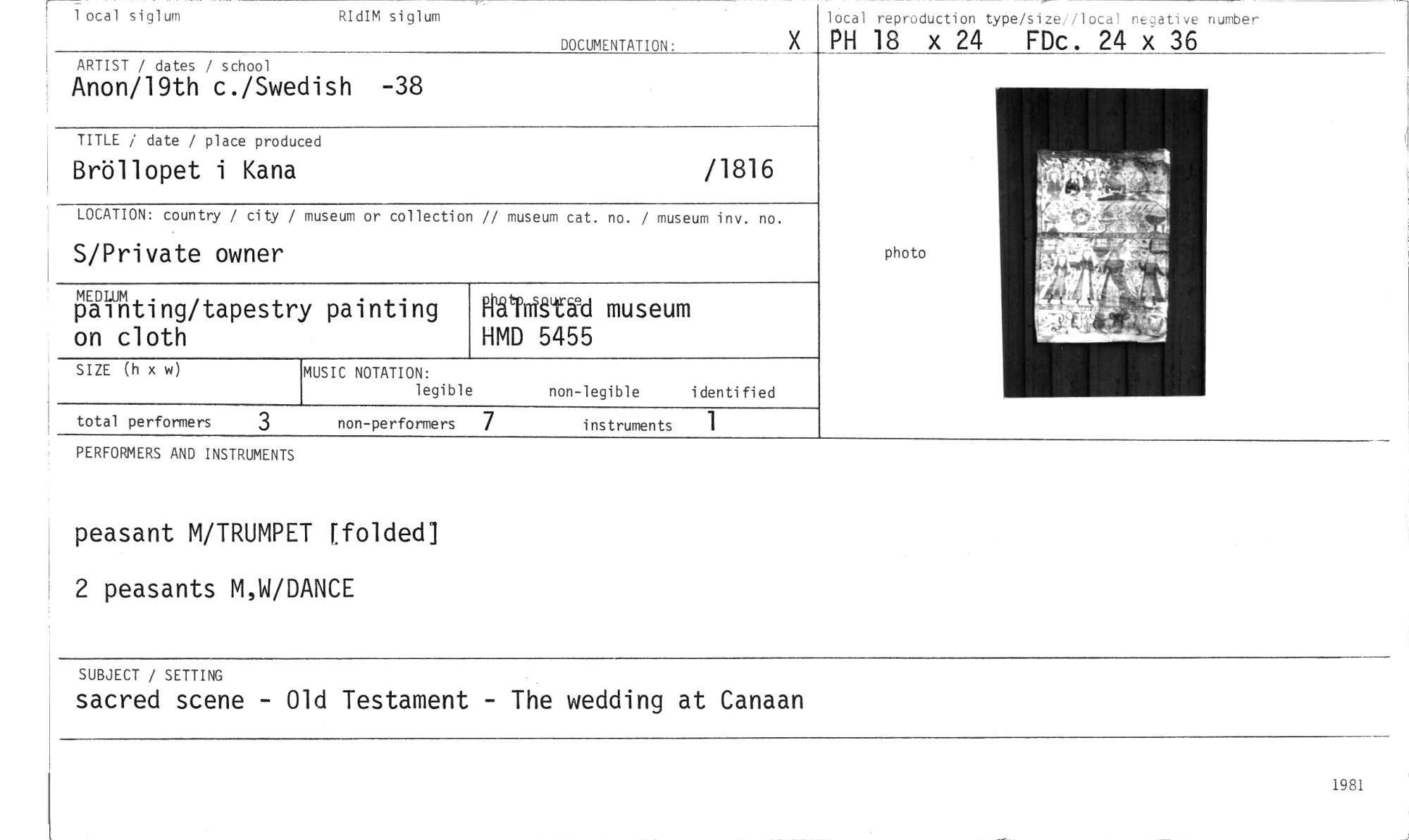 //// 1 ocal siglum RIdIM siglum //// DOCUMENTATION. //// local reproduction type/size//local negative number //// PH 18 x 24 FDc. 24 x 36 //// ARTIST / dates / school //// Anon/19th c./Swedish -38 //// TITLE / date / place produced //// Bröllopet i Kana /1816 //// LOCATION: country / city / museum or collection // museum cat. no. / museum inv. no. //// S/Private owner //// MEDLUM //// painting/tapestry painting on cloth //// SIZE (h x w) //// non-legible identified //// total performers 3 non-performers instruments //// MUSIC NOTATION: //// legible //// näYletäd museum HMD 5455 //// photo //// PERFORMERS AND INSTRUMENTS //// peasant M/TRUMPET [folded] //// 2 peasants M,W/DANCE //// SUBJECT / SETTING //// sacred scene - Old Testament - The wedding at Canaan //// 1981 ////