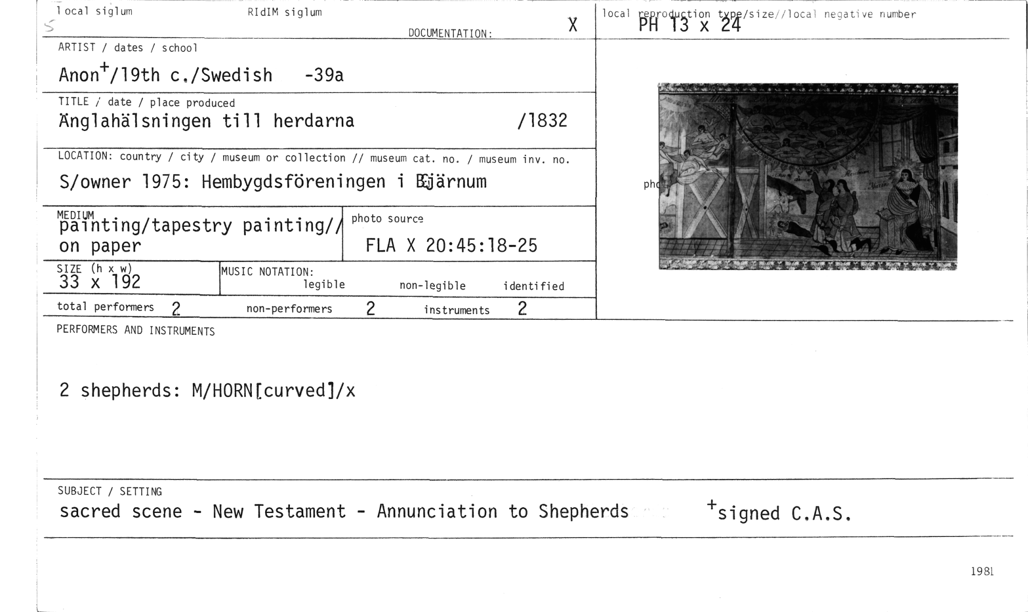 //// 1 ocal siglum RIdIM siglum //// DOCUMENTATION: //// local fgfodp;pon txu/sizei/local negative number ii //// ARTIST / dates / school //// Anon4719th c./Swedish -39a //// TITLE / date / place produced //// Änglahälsningen till herdarna /1832 //// LOCATION: country / city / museum or collection // museum cat. no. / museum inv. no. //// S/owner 1975: Hembygdsföreningen i ffjärnum //// MEDIUM //// painting/tapestry painting!! photo source //// FLA X 20:45:18-25 //// on paper //// SIZE (h x w) MUSIC NOTATION: //// 33 x 192 legible non-legible identified //// //// //// ph • //// total performers 2 non-performers 2 instruments 2 //// PERFORMERS AND INSTRUMENTS //// 2 shepherds: M/HORN[curved]ix //// SUBJECT / SETTING //// sacred scene - New Testament - Annunciation to Shepherds +signed C.A.S. //// 198L ////