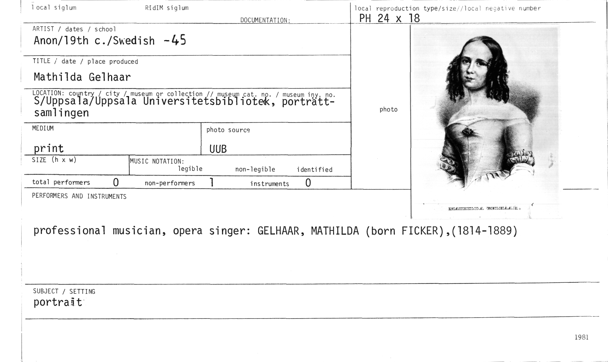 //// lotal reproduction type/size//local negative number //// PH 24 x 18 //// 1 otal siglum RidIM siglum //// DOCUMENTATION• //// ARTIST / dates / school //// TITLE / date / place produ //// Mathilda Gelhaai //// LOCATION: country / city / //// S/Uppsala/Uppsa samlingen //// MEDIUM //// print //// SIZE (h x w) //// PERFORMERS AND INSTRUMENTS //// ed //// museum or collection // museum cat. np. / museum inv. no. //// a Universitetsbibliotek, porträtt- //// Anon/19th c./Sw dish -45 //// photo source //// UUB //// MUSIC NOTATION: //// legible non-legible identified //// total performers non-performers 1 instruments 0 //// photo //// rg.6—, ML. INITteIILILLM, //// professional musician, opera singer: GELHAAR, MATHILDA (born FICKER),(1814-1889) //// SUBJECT / SETTING //// portrait //// 1981 ////