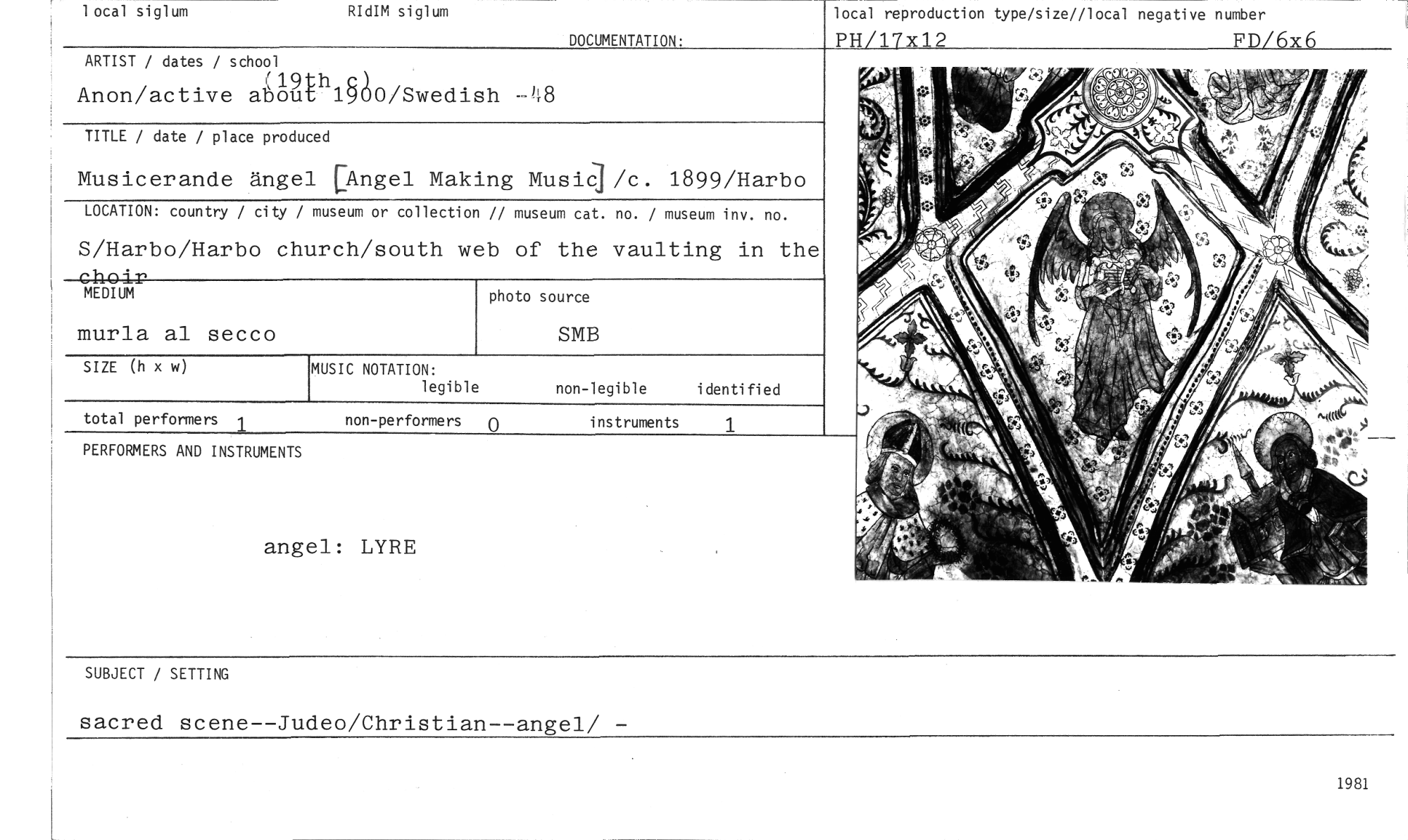 //// lotal siglum //// RIdIM siglum //// DOCUMENTATION. //// local reproduction type/size//local negative number PH/17x12 FD/6x6 //// ARTIST / dates / school //// (19th Cl //// Anon/active about 19o0/Swedish --48 //// TITLE / date / place produced //// Musicerande ängel Angel Making MusiCl/c. 1899/Harbo //// LOCATION: country / city / museum or collection // museum cat. no. / museum inv. no. //// S/Harbo/Harbo church/south //// 414444' //// MEDIUM //// web of the vaulting in the //// photo source //// murla al secco //// SMB //// SIZE (h x w) //// MUSIC NOTATION: //// legible //// non-legible identified //// total performers //// 1 //// non-performers 0 instruments //// PERFORMERS AND INSTRUMENTS //// angel: LYRE //// SUBJECT / SETTING //// sacred scene--Judeo/Christian--angel/ - //// 1981 ////