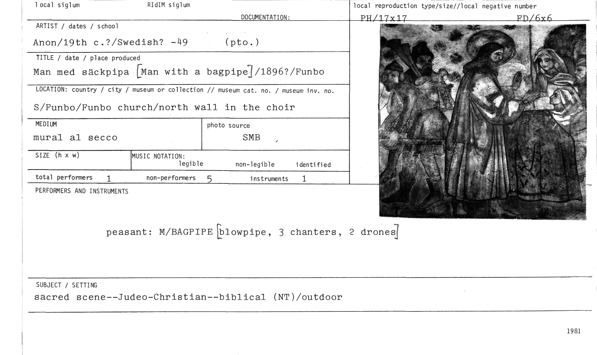 //// SUBJECT / SETTING //// sacred scene--Judeo-Christian--biblical (NT)/outdoor //// 1 ocal siglum //// RIdIM siglum //// local reproduction type/size//local negative number //// PH/17x17 FD/63(å //// DOCUMENTATION. //// ARTIST / dates / school //// photo source //// SMB //// mural al secco //// MEDIUM //// total performers 1 //// PERFORMERS AND INSTRUMENTS //// non-performers 5 instruments 1 //// Anon/19th c.?/Swedish? -49 (pto.) //// TITLE / date / place produced //// Man med säckpipa [Man with a bagpipe]/1896?/Funbo //// LOCATION: country / city / museum or collection // museum cat. no. / museum inv. no. //// S/Funbo/Funbo church/north wall in the choir //// SIZE (h x w) //// MUSIC NOTATION: //// legible //// non-legible identified //// peasant: M/BAGPIPEIblowpipe, 3 chanters, 2 drones //// 1951 ////
