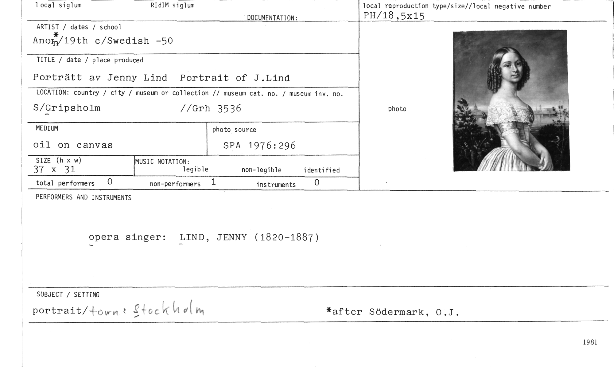 //// 1981 //// //Grh 3536 //// S/Gripsholm //// MUSIC NOTATION: //// legible //// non-legible identified //// photo //// 1 //// 0 //// 0 //// instruments //// non-performers //// total performers //// local reproduction type/size//local negative nutuber //// PH/18,5x15 //// local siglum RIdIM siglum //// DOCUMENTATION. //// ARTIST / dates / school //// Anoki/19th c/Swedish -50 //// TITLE / date / place produced //// Porträtt av Jenny Lind Portrait of J.Lind //// LOCATION: country / city / museum or collection // museum cat. no. / museum inv. no. //// photo source //// SPA 1976:296 //// SIZE (h x w) //// 37 x 31 //// PERFORMERS AND INSTRUMENTS //// opera singer: LIND, JENNY (1820-1887) //// SUBJECT / SETTING //// pOrtralt/+00, t .g+ock(404 *af ter Södermark, 0 . J . //// MEDIUM //// oil on canvas ////