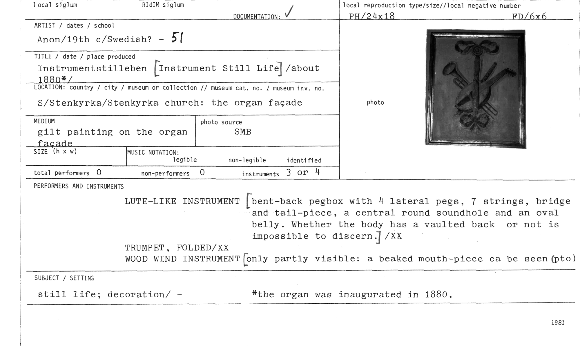 //// local siglum RIdIM siglum //// local reproduction type/si2e//local negativenumber //// PH/24x18 FD/6x6 //// DOCUMENTATION: //// 1981 //// photo //// instruments 3 or 4 //// total performers 0 non-performers 0 //// TRUMPET, FOLDED/XX //// WOOD WIND INSTRUMENT [only partly visible: a beaked mouth-piece ca be seen(pto) //// LUTE-LIKE INSTRUMENT rbent-back pegbox with 4 lateral pegs, 7 strings, bridge //// and tail-piece, a central round soundhole and an oval //// belly. Whether the body has a vaulted back or not is impossible to discerng /XX //// ARTIST / dates / school //// Anon/19th c/Swedish? — 51 //// TITLE / date / place produced //// Instrumentstilleben [Instrument Still Life] about //// 1880*/ LOCATION: country / city / museum or collection // museum cat. no. / museum inv. no. //// S/Stenkyrka/Stenkyrka church: the organ faade //// MEDIUM //// gilt painting on the organ //// faQade //// SIZE (h x w) //// non-legible identified //// photo source //// SMB //// MUSIC NOTATION: //// legible //// PERFORMERS AND INSTRUMENTS //// SUBJECT / SETTING //// still life; decoration/ - *the organ was inaugurated in 1880. ////