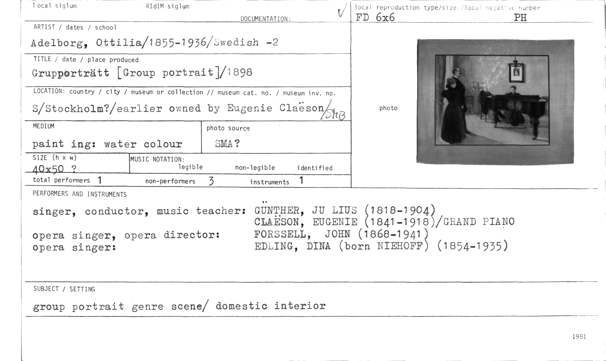 //// 1 ocal siglum RIdIM siglum //// lotal reprocluction type/size. lo ca, cec.at //// FD 6x6 PH //// DOCUMENTATION: //// ARTIST / dates / school //// Adelborg, Ottilia/1855-1936/ wedish -2 //// TITLE / date / place produced //// Gruppörträtt [Group portrait]/1898 //// LOCATION: country / city / museum or collection // museum cat. no. / museum inv. no. //// S/Stockholm?/earlier owned by Eugenie Claeson //// photo source //// SMA ? //// SIZE (h x w) //// 403750 7 //// total performers 1 //// MEDIUM //// paint ing: water colour //// MUSIC NOTATION: non-legible identified. //// legible instruments 1 //// non-performers 3 //// //// photo //// PERFORMERS AND INSTRUMENTS //// singer, conductor, music teacher: //// opera singer, opera director: opera singer: //// GUNTHER, JU LIUS {1818-1904 //// CLAESON, EUGENIE 1841-191d/GRAND PIANO FORSSELL, JOHN (1868-1941) //// EDLING, DINA (borra NIEHOFF) (1854-1935) //// SUBJECT / SETTING //// group portrait genre scene/ domestic interior //// 1981 ////