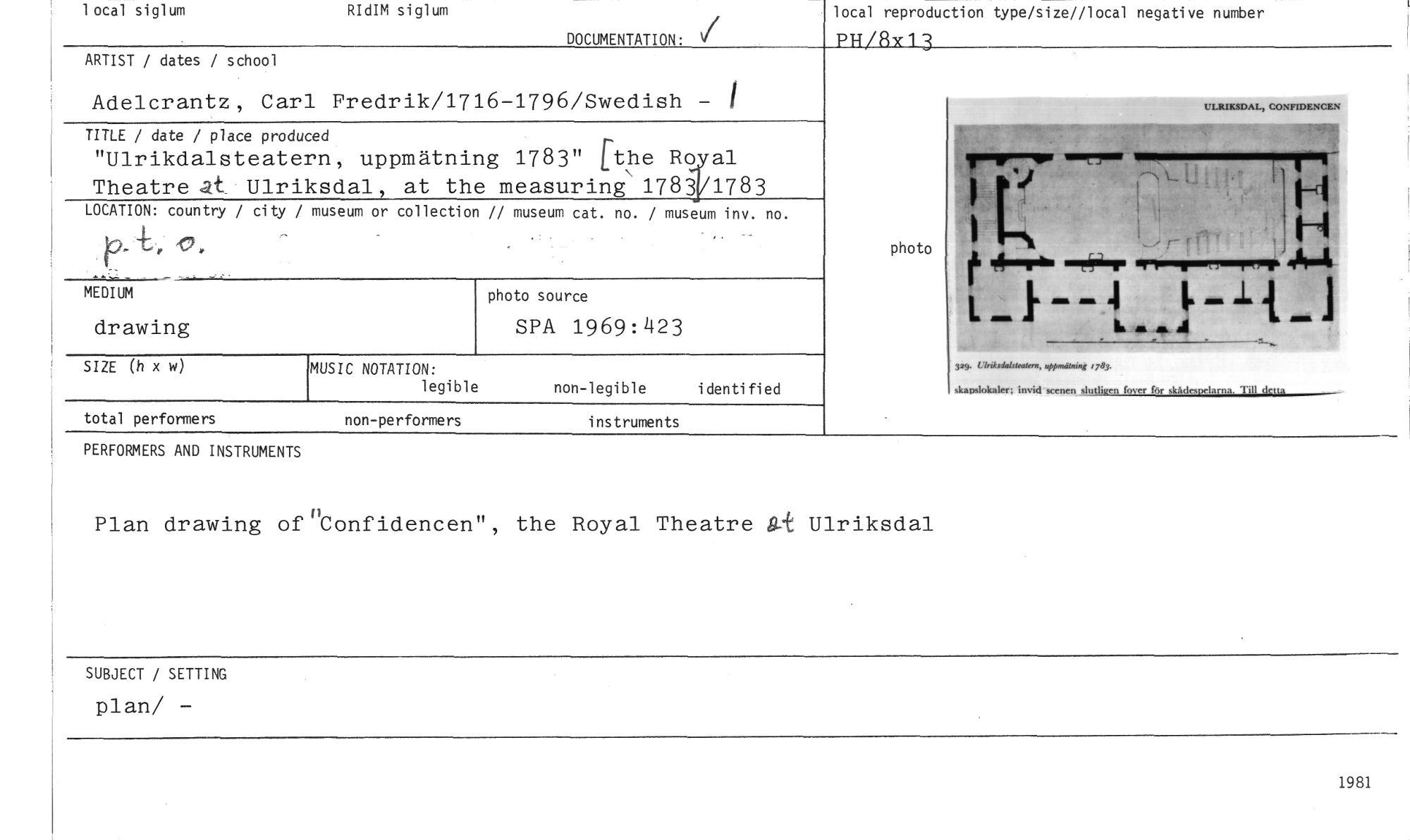 //// local siglum RIdIM siglum //// DOCUMENTATION: //// ARTIST / dates / school //// Adelcrantz, Carl Fredrik/1716-1796/Swedish - 1 //// TITLE / date / place produced //// "Ulrikdalsteatern, uppmätning 1783" [the Ro al Theatre 4t Ulriksdal, at the measuring\1783 1783 //// LOCATION: country / city / museum or collection // museum cat. no. / museum inv. no. //// photo source //// SPA 1969:423 //// SIZE (h x w) //// non-legible identified //// MEDIUM //// drawing //// MUSIC NOTATION: //// legible //// 11.1,11,1 CM 1:11-,,,C //// i1-DI //// f 1 //// I 4 It -11 //// .. Ä //// • //// 329. Clrek,dalstealer uppmatnar« (783. //// skanslokaler, invid scenen slutlipen fover för skådespelarna. Till detta //// photo //// total performers non-performers instruments //// PERFONNERS AND INSTRUMENTS //// Plan drawing of"Confidencen", the Royal Theatre 9.-+ Ulriksdal //// SUBJECT / SETTING //// plan/ - //// local reproduction type/size//local negative number //// PH/8x13 //// 1981 ////