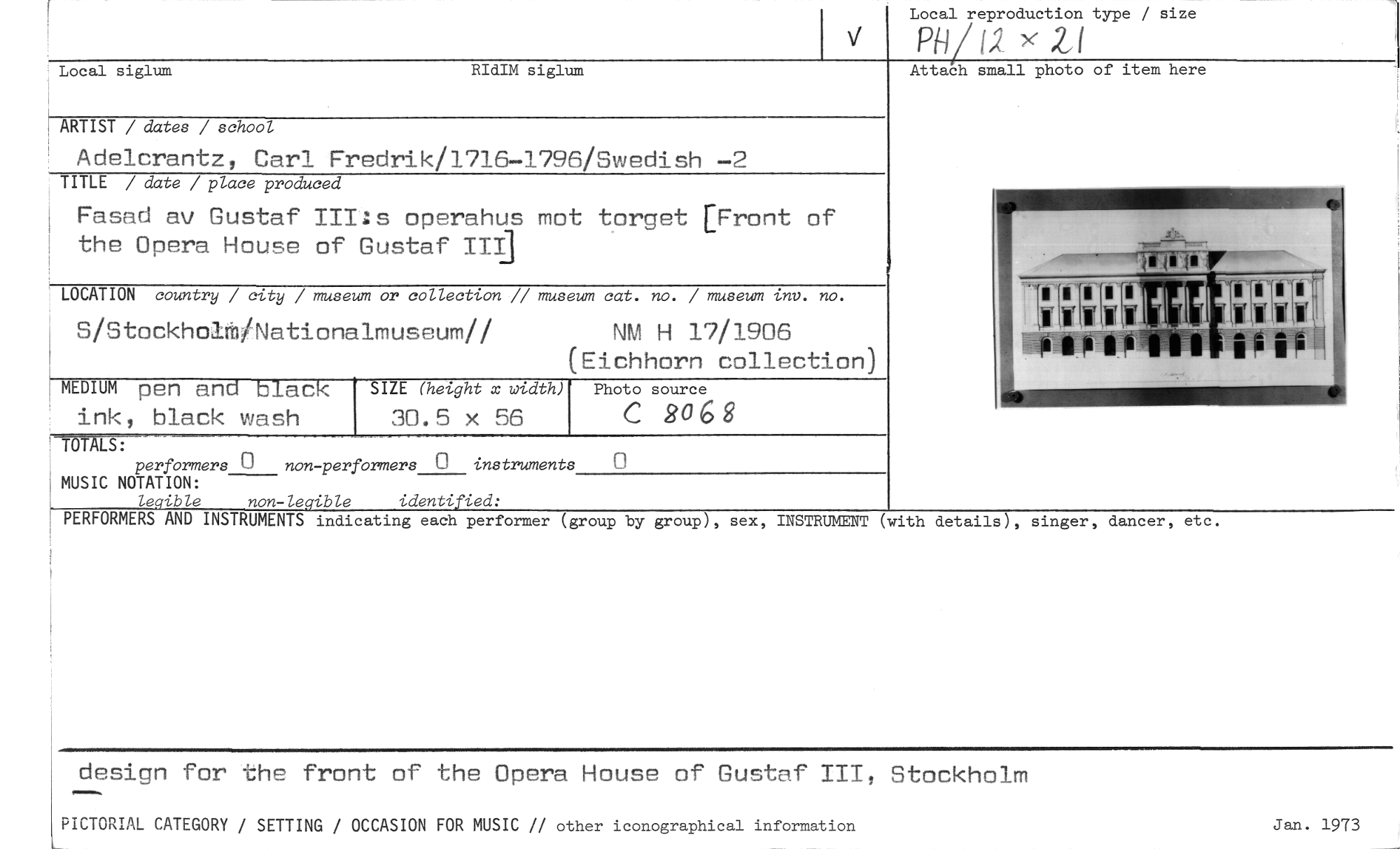 //// Local siglum RIdIM siglum //// ARTIST / dates / school //// Adelcrantz, Carl Fredrik/1716-1796/Swedish —2 //// TITLE / date / place produced //// Fasad av Gustaf III:s operahus mot torget [Front of the Opera House of Gustaf III] //// LOCATION country / city / museum or collection // museum cat. no. / museum inv. no. //// S/Stockholå/Nationalmuseum// NM H 17/1906 //// (Eichhorn collection) //// Local reproduction type / size //// PM/ 12 2.1 //// Attach small photo of item here //// MEDIUM pen and black SIZE (height x width) Photo source //// C so 6 8 //// perförmers 0 non -performers 0 instruments 0 //// MUSIC NOTATION: --- //// legible non -legible identified: //// PERFORMERS AND INSTRUMENTS indicating each performer (group by group), sex, INSTRUMENT (with details), singer, dancer, etc. //// ink, black wash 30.5 x 56 //// OTALS: //// design for the front of the Opera House of Gustaf III, Stockholm //// PICTORIAL CATEGORY / SETTING / OCCASION FOR MUSIC // other iconographical information Jan. 1973 ////