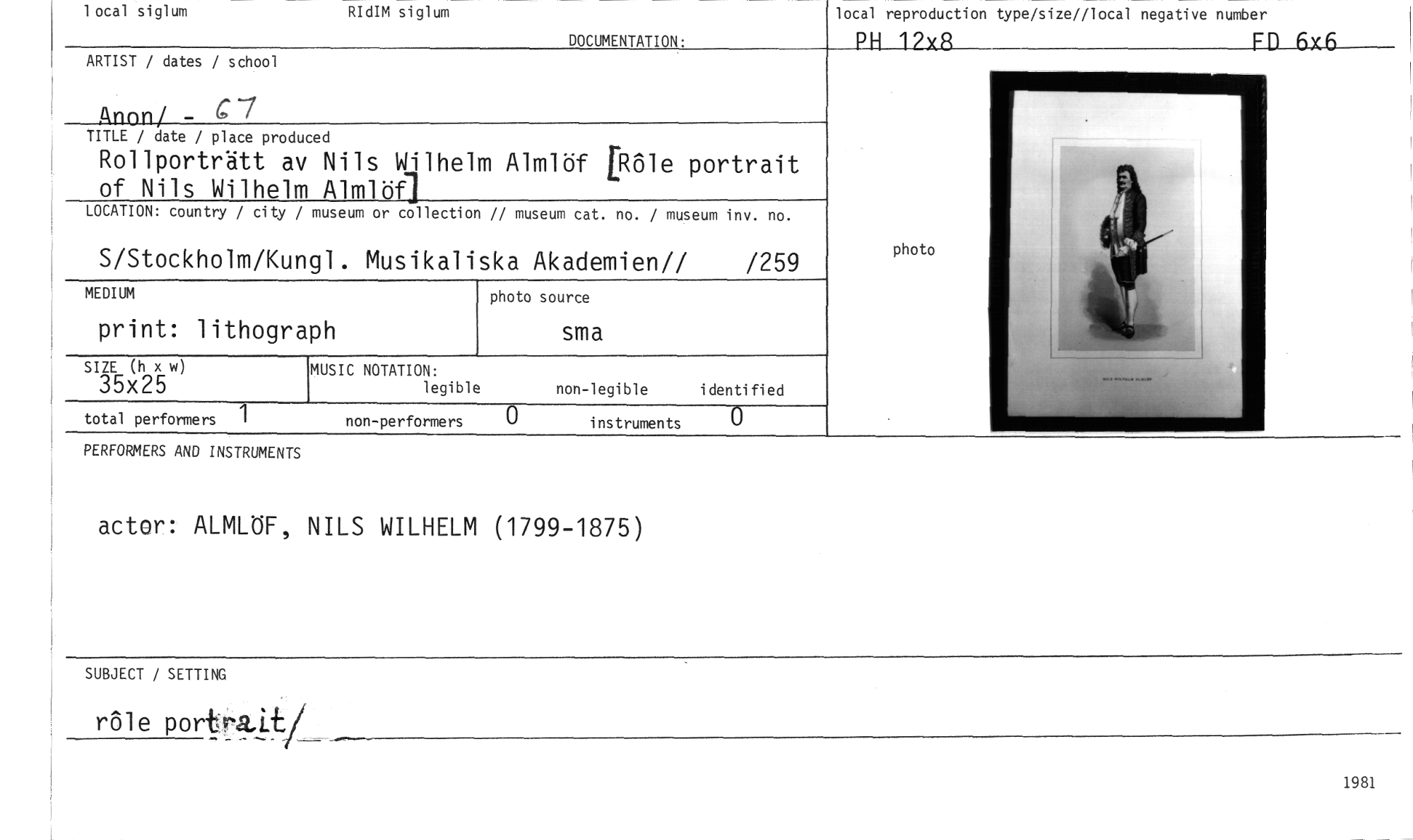 //// DOCUMENTATION. //// local reproduction type/size//local negative number //// PH 12x8 Fn _.6x6 //// 1 ocal siglum RIdIM siglum //// ARTIST / dates / school //// Anon' - C7 //// TITLE / date / place produced //// Rollporträtt av Nils Wilhelm Almlöf [Röle portrait //// of Nils Wilhelm Almlöf] //// LOCATION: country / city / museum or collection // museum cat. no. / museum inv. no. //// S/Stockholm/Kungl. Musikaliska Akademien// /259 //// SIZE (h x w) //// 35x25 //// MEDIUM //// print: lithograph //// MUSIC NOTATION: //// legible non-legible identified //// photo source //// sma //// total performers 1 non-performers V instruments 0 //// photo //// PERFORMERS AND INSTRUMENTS //// actor: ALMLÖF, NILS WILHELM (1799-1875) //// SUBJECT / SETTING //// röl e portrait/ //// 1981 ////