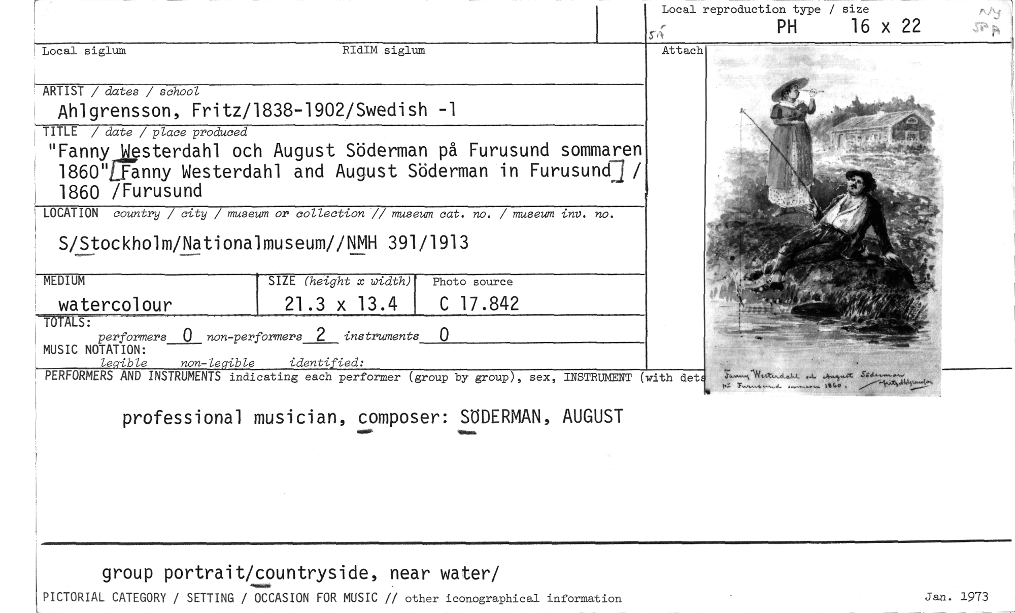 //// Local reproduction type / size //// PH 16 x 22 //// Local siglum RIdIM siglum //// Attach //// ARTIST / dates / school //// Ahlgrensson, Fritz/1838-1902/Swedish -1 //// TITLE / date / place produced //// "Fannysterdahl och August Söderman på Furusund sommaren 1860trajtnny Westerdahl and August Söderman in Furusund / 1860 /Furusund //// LOCATION country / city / museum or collection // museum cat. no. / museum inv. no. //// S/Stockholm/Nationalmuseum//NMH 391/1913 //// SIZE (height x width) //// 21.3 x 13.4 //// performers 0 non-performers 2 instruments //// MUSIC NOTATION: //// leoible non-leqible identified: //// PERFORMERS AND INSTRUMENTS indicating each performer (group by group), sex, INSTRUMENT (with det //// MEDIUM watercolour //// Photo source //// C 17.842 0 //// .4. .44.14. //// professional musician, composer: SÖDERMAN, AUGUST //// group portrait/countryside, near water/ //// PICTORIAL CATEGORY / SETTING / OCCASION FOR MUSIC // other iconographical information //// Jan. 1973 ////