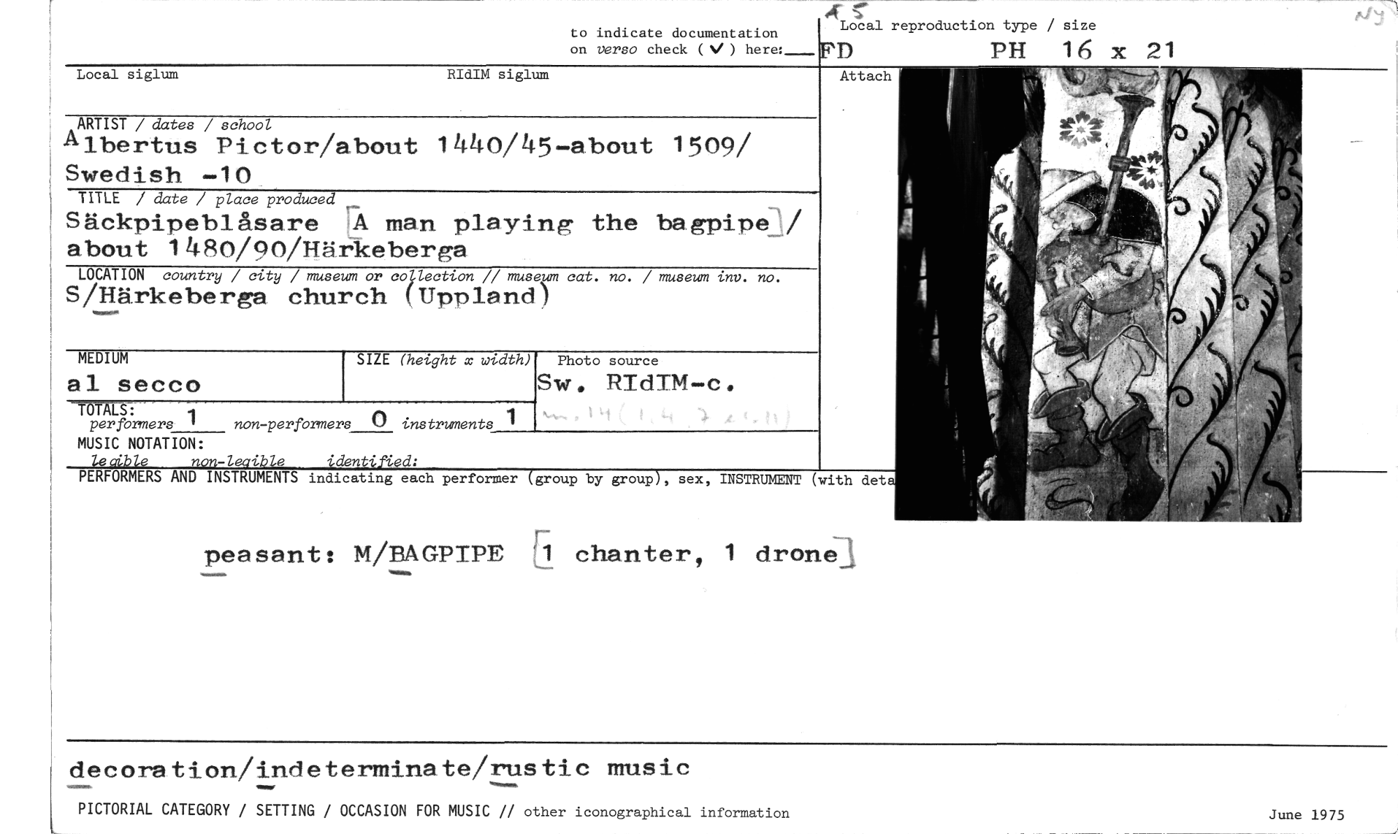 //// peasant: M/BAGPIPE r1 chanter, 1 dronet //// decoration/indeterminate/rustic music June 1975 //// PICTORIAL CATEGORY / SETTING / OCCASION FOR MUSIC // other iconographical information //// to indicate documentation Local reproduction type / size //// on verso check (V) here:_ FD PH 16 x 21 //// Local siglum RIdIM siglum //// ARTIST / dates / school //// Albertus Pictor/about 1440/45-about 1509/ Swedish -10 //// TITLE / date / place produced //// Säckpipeblåsare A man playing the bagpipe_./ about 1480/90/Härkeberga //// LOCATION country / city / museum or copection // museum cat. no. / museum inv. no. //// S/Härkeberga church (Uppland) //// MEDIUM //// al secco //// T T LS: //// per formers 1 non-performers 0 instruments //// MUSIC NOTATION: //// Photo source //// Sw, RidTM-c. //// e 'den is.; //// PERFORMERS AND INSTRUMENTS indicating each performer group by group , sex, INSTRUMENT (with det //// SIZE (hetght x width) ////