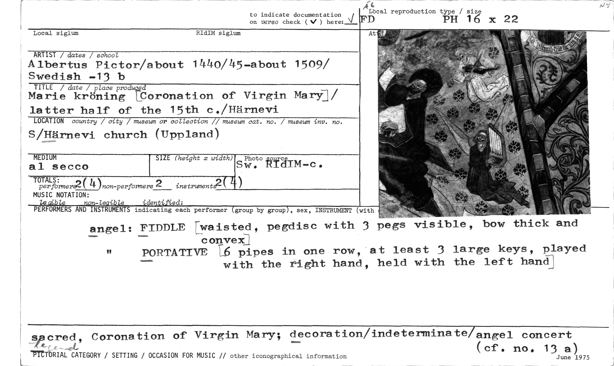 //// Ar4 //// to indicate documentation / //// Löcal reproduction typ / size //// on versa check (V ) here: \( PH 16 22 //// Local siglum RIdIM siglum //// ARTIST / dates / school //// AlbertUS Pictor/about 1440/45-about 1509/ Swedish -13 b //// TITLE / date / place prod d //// Marie kröning Coronation of Virgin Mary] latter haif of the 15th c./Härnevi //// LOCATION country / city / museum or collection // museum cat. no. / museum inv. no. //// S/Härnevi church (Uppland) //// SIZE (height x width) //// TETALS: //// per foryner.2( 4 )non-perfomers 2 //// MUSIC NOTATION: //// -1 ib e .dent. ied: //// PERFORMERS AND INSTRUMENTS indicating each performer //// MEDIUM //// al secco //// instruments2C1"") //// Photo source //// Sw. RIdTM-c. //// At //// group by group , sex, INSTRUMENT (with //// visible, //// bow thick and //// angel: FIDDLE Twaisted, pegdisc with 3 pegs //// conve*2 //// n PORTATIVE 55 pipel in one row, at least 3 large keys, played //// with the right hand, held with the left hand] //// secred, Coronation of Virgin Mary; decoration/indeterminate //// /angel concert (cf. no. 13 a) //// June 1975 //// TirTÖRIAL CATEGORY / SETTING / OCCASION FOR MUSIC // other iconographical information ////