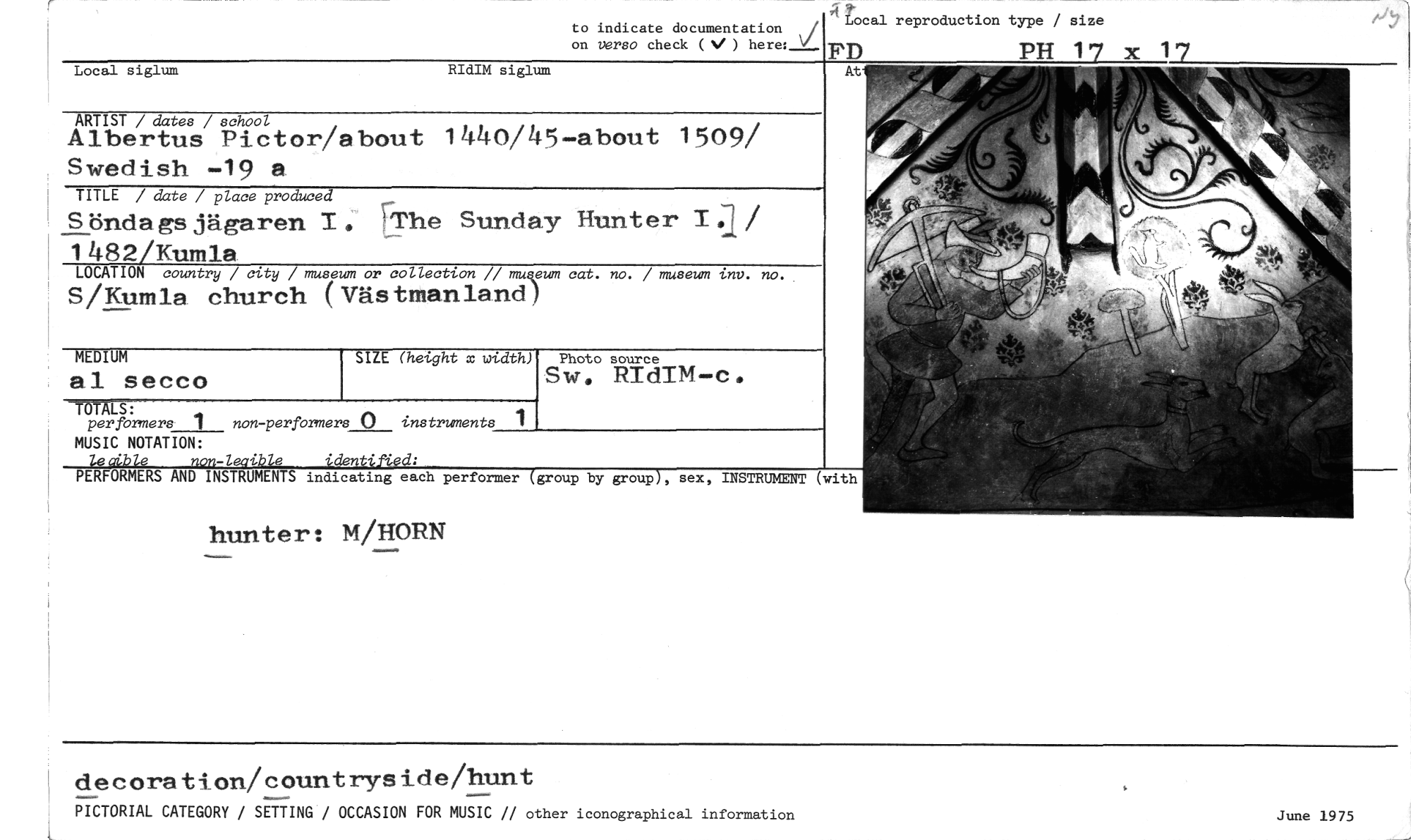 //// decoration/countryside/hunt //// PICTORIAL CATEGORY / SETTING / OCCASION FOR MUSIC // other iconographical information //// June 1975 //// MEDIUM //// al secco //// SIZE (height x width) //// Photo source //// Sw. //// to indicate documentation //// on verso check ( ) here:_k_ //// Local siglum RIdIM siglum //// Local reproduction type / size //// FD PH 17 x 17 //// ARTIST / dates / school //// Albertus Pictor/about 1440/45-about 1509/ Swedish -19 a //// TITLE / date / place produced //// - r //// Söndagsjägaren I. The Sunday Hunter I.1/ //// 1482/Kumla. //// LOCATION country / city / museum or collection // museum cat. no. / museum inv. no. //// S/Kumla church (Västmanland) //// TOTALS: //// per formers 1 non-performers O instruments //// MUSIC NOTATION: e -1 i e 'de ed: PE FORMERS AND INSTRUMENTS indicating each performer group by group , sex, INSTRUMENT (with //// hunter: M/HORN ////