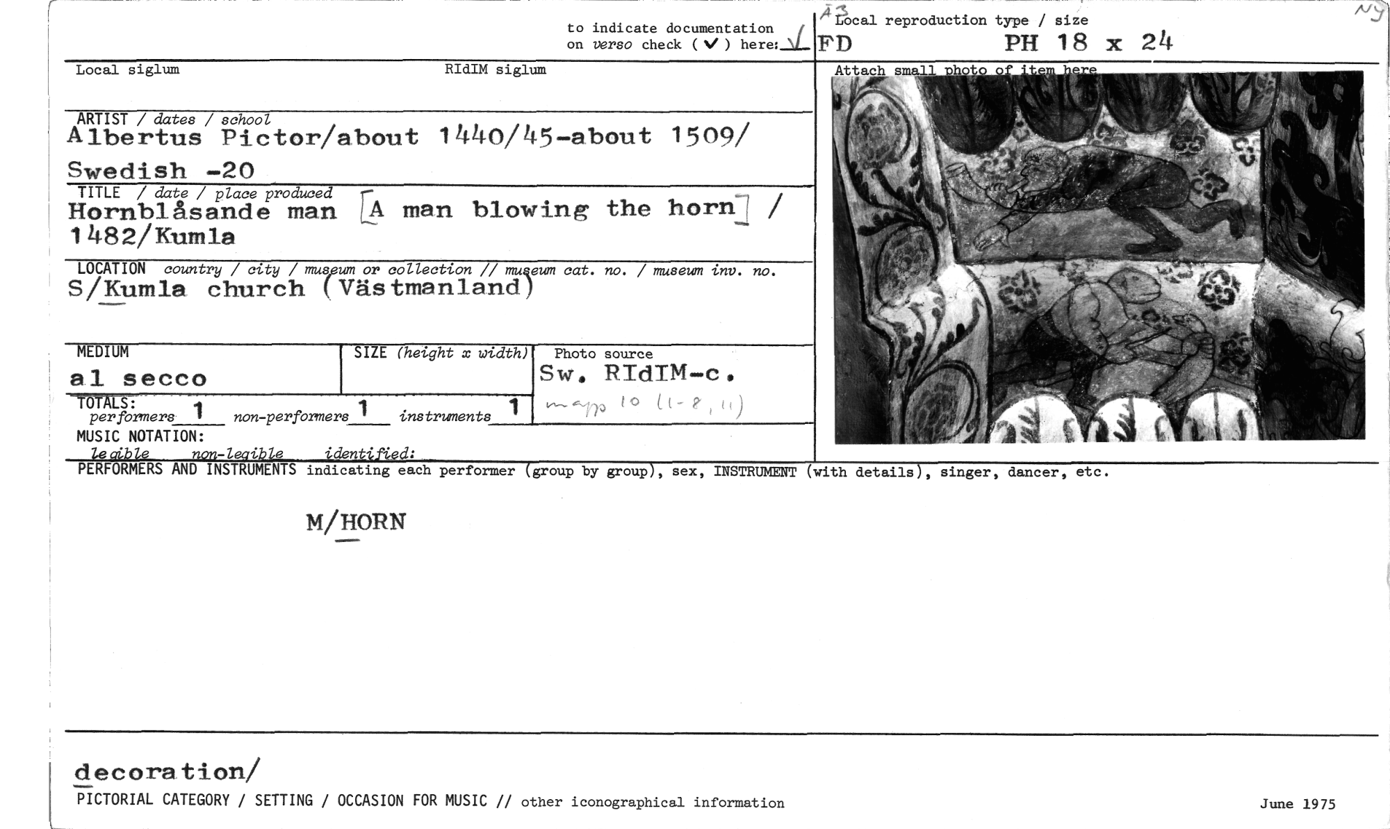 //// to indicate documentation //// on versa check ( ) here: }a_ //// /4acal reproduction type / size //// FD PH 18 x 24 //// Local siglum RIdIM siglum //// ARTIST / dates / school //// Albertus Pictor/about 1440/45-about 1509/ Swedish -20 //// Hornblåsande man man blowing the horn-I / //// TITLE / date / place produced //// 1482/Kumla //// LOCATION country / city / mumum or collection // muzeum cat. no. / museum inv. no. //// S/Kumla church (Västmanland) //// MEDIUM //// al se cco //// MUE- //// per formers 4 non-perfOrmers 1 instruments //// MUSIC NOTATION: //// Zeabie non-leaible identiAed: //// PERFORMERS AND INSTRUMENTS indicating each performer (group by group), sex, INSTRUMENT (with details), singer, dancer, etc. //// M/HORN //// decora tion/ //// PICTORIAL CATEGORY / SETTING / OCCASION FOR MUSIC // other iconographical information //// June 1975 //// //// SIZE (height x width) //// Photo source //// Sw. RIdIM-c. //// - i 0 i, t 7 ////