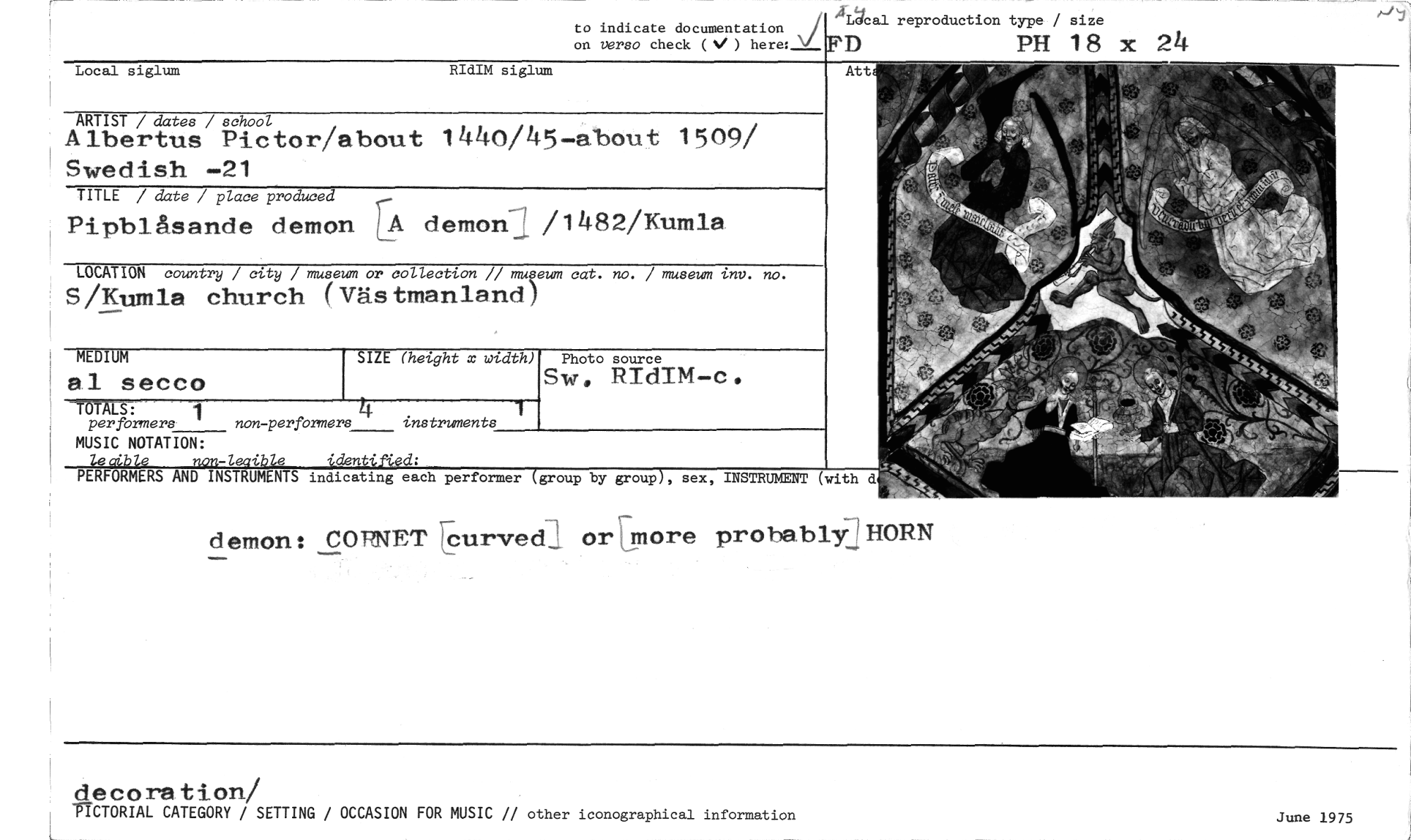 //// to indicate documentation //// on verso check ( ) here: 9/ //// ÅL4ca1 reproduction type / size //// FD PH 18 x 24 //// RIdIM siglum //// Local siglum //// ARTIST / dates / school , //// A lbertus ctor/about 1440/45-about 1509/ Swedish -21 //// TITLE / date / place produced //// Pipblåsande demon LA demon_,, /1482/Kumla //// LOCATION country / city / museum or collection // museum cat. no. //// S /Ktunla church ( Väs tmanland ) //// / museum tnv. no. //// SIZE (hetght x width) //// Photo source //// Sw. RidIM-c . //// TT TALS //// per formers- non-per formers instruments //// MUSIC NOTATION: //// -/ //// PERFORMERS AND INSTRUMENTS //// indicating each performer group by group , sex, INSTRUMENT (with d //// demon: COTNET kurved_'' ormore proba HORN //// MEDIUM //// a 1 s eec° //// decora tion/ //// 1TCTORIAL CATEGORY / SETTING / OCCASION FOR MUSIC // other iconographical information //// June 1975 ////
