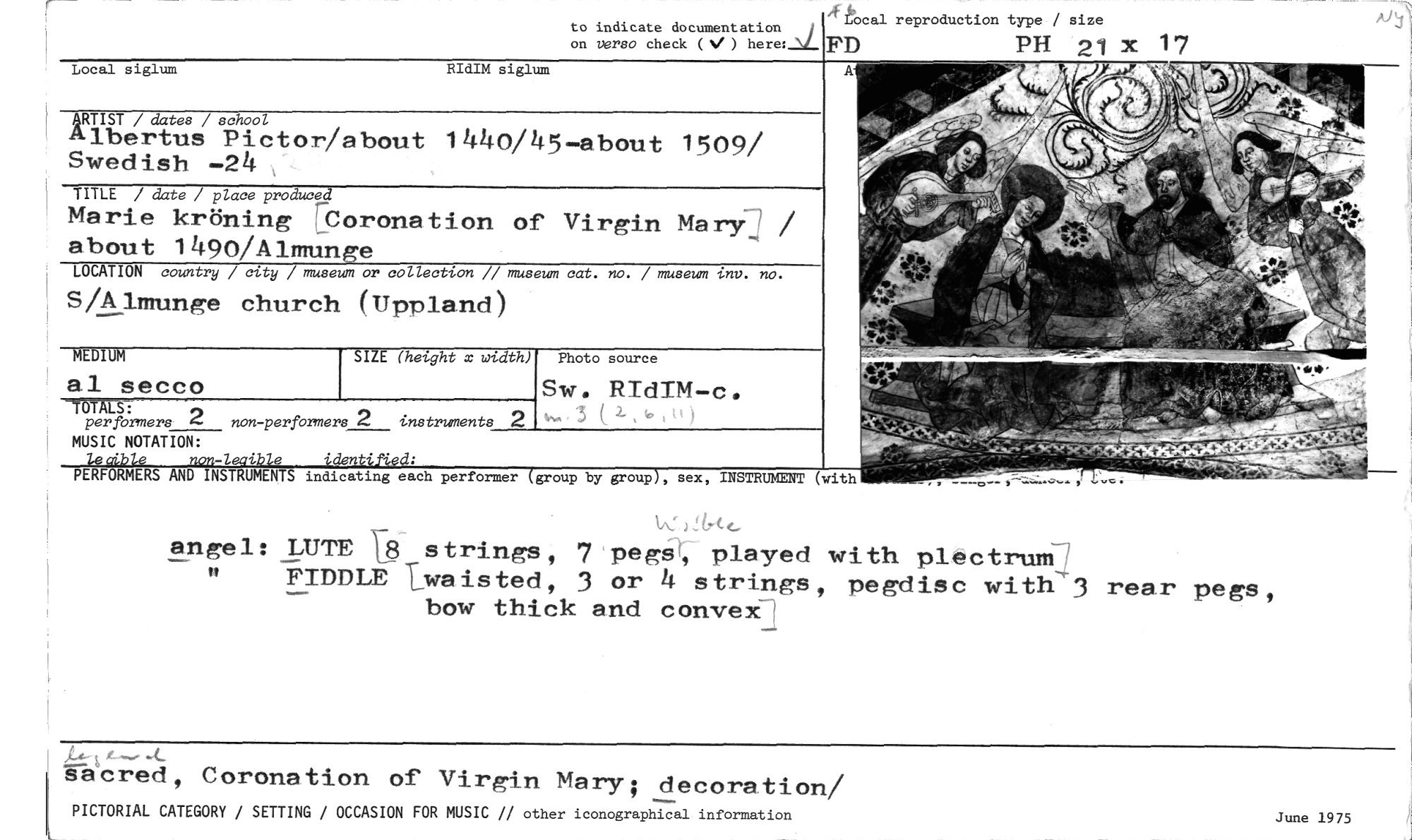 //// angel: LUTE 13. strings, 7 pegs, played with plectrum-' //// FIDDLE lwaisted, 3 or 4 strings, pegdisc with"-3 reor pegs, bow thick and convex //// r //// to indicate documentation on verso check ( ) //// Local reproduction type / size //// FD PH 21 x 17 //// Local siglum //// RIdIM siglum //// group by group , sex, INSTRUMENT (with //// AND INSTRUMENTS indicating each performer //// PERFORMERS //// ARTIST / dates / school //// Albertus Pictor/about 1440/45-about 1509/ Swedish -24 //// TITLE / date / place produced //// Marie kröning 'Coronation of Virgin Mary' / //// about 1490/Almunge //// LOCATION country / city / museum or collection // museum cat. no. / museum inv. no. //// S/Almunge church (Uppland) //// MEDIUM //// al secco //// per formers 2 //// MUSIC NOTATION: //// e //// SIZE (height x width) //// non-performers 2 instruments //// Photo source //// Sw. RidIM -c. //// Wåered, Coronation of Virgin Mary; decoration/ //// PICTORIAL CATEGORY / SETTING / OCCASION FOR MUSIC // other iconographical information June 1975 ////