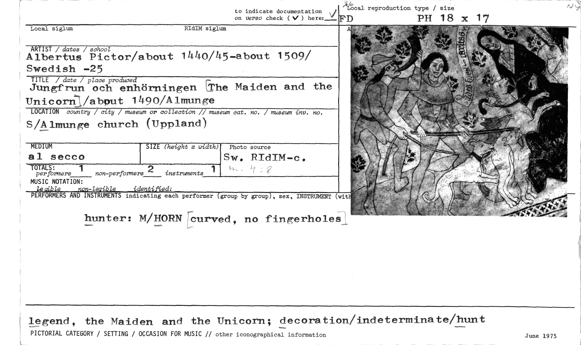 //// June 1975 //// legend, the Maiden and the Unicorn. decoration/indeterminate/hunt //// _ //// PICTORIAL CATEGORY / SETTING / OCCASION FOR MUSIC // other iconographical information //// )Y;Ocal reproduction type / size //// FD PH 18 x 1 //// to indicate documentation //// on verso check ( ) here:___ //// Local siglum //// RIdIM siglum //// A //// SIZE (height x width) //// MEDIUM //// al secco //// Photo source //// Sw, RIdIM-c. //// ARTIST / dates / school //// Albertus Pictor/about 1440/45-about 1509/ ,Swedish -25 //// TITLE / date / place produced //// Jungfrun och enhörningen The Maiden and the //// Unicorrr/abput 1490/Almunge //// LOCATION country / city / museum or collection // museum cat. no. / museum inv. no. //// S/A lmunge church (Uppland) //// -TOTALS: //// performers 1 //// non-performers 2 instruments //// MUSIC NOTATION: //// l i e dent ed. //// PERFORMERS AND INS RUMENTS indicating each performer group by group , sex, INSTRUMENT (vit //// hunter: M/HORN curved, no fingerholes //// , //// ,...?"A ////