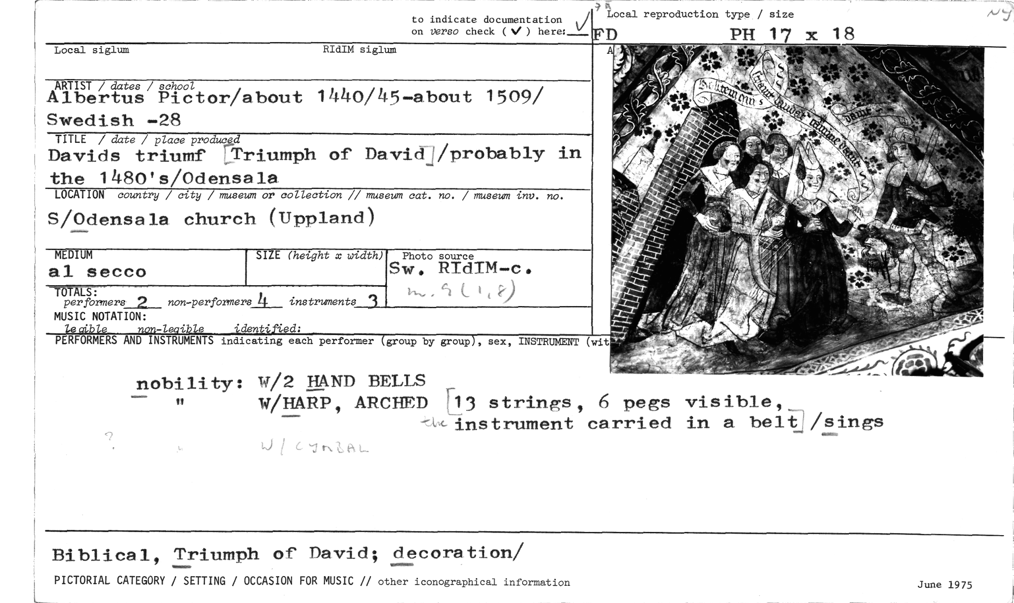 //// to indicate documentation Local reproduction type / size //// on verso check (V ) here: FDPli 17 x 18 //// Local siglum RIdIM siglum //// ARTIST / dates / school //// Albertus Pictor/about 1440/45-about 1509/ Swedish -28 //// TITLE / date / place prodned //// Davids triumf Yriumph of Davidlprobably in the 1480's/Odensala. //// LOCATION country / city / museum or collection // museum cat. no. / museum inv. no. //// S/Odensala church (Uppland) //// MEDIUM SIZE (height x width) Photo source //// al secco Sw. RTdTM -c. //// TOTALS: .?) //// per formers non-performers 4 instrumente_a- //// MUSIC NOTATION: //// 4ecribLe non-Leaible identified: //// PERFORMERS AND INSTRUMENTS indicating each performer (group by group), sex, INSTRUMENT //// W/HARP, ARCIIED r13 strings, 6 pegs //// e instrument carried in a bett' sings //// nobility: V/2 HAND BELLS //// tt //// L //// Biblical, Triumph of David; decoration/ //// PICTORIAL CATEGORY / SETTING / OCCASION FOR MUSIC // other iconographical information //// „Tune 1975 ////