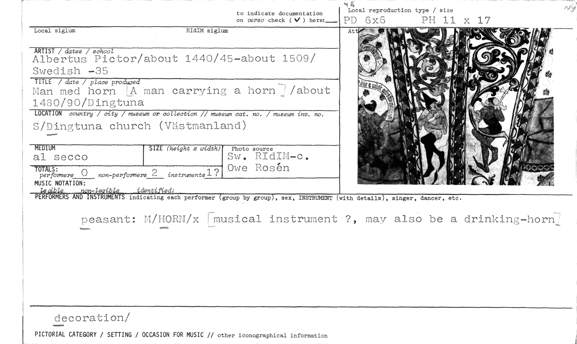 //// to indicate documentation //// on verso check (%/ ) here:___ //// "./y //// 44 //// Local reproduction type / size //// PD 6x6 PH 11 x 17 //// Local siglum //// RIdIM siglum //// ARTIST / dates / school //// Albertus Pictor/about 1440/45-about 1509/ Swedish -35 //// TITLE / date / place produced //// Man med horn LA man carrying a horn-/about 1480/90/Dingtuna //// city / museum or collection // museum cat. no. / museum inv. no. //// church (Västmanland) //// MEDIUM //// al secco //// Photo source //// SIZE (hetght x width) //// LS: //// per formers 0 non-performers 2 instruments //// Sw. RIdIM-c. Owe Rosen //// MUSIC NOTATION: //// 1-.i. - den ed. //// PERFORMERS AND INSTRUMENTS indicating each performe //// group by group //// , sex, INSTRUMENT (with details , singer, dancer, etc. //// peasant: M/HORN/x [-musical instrument ?, may also be a drinking-horn //// decoration/ //// PICTORIAL CATEGORY / SETTING / OCCASION FOR MUSIC // other iconographical information //// LOCATION country / //// S/Dingtuna ////