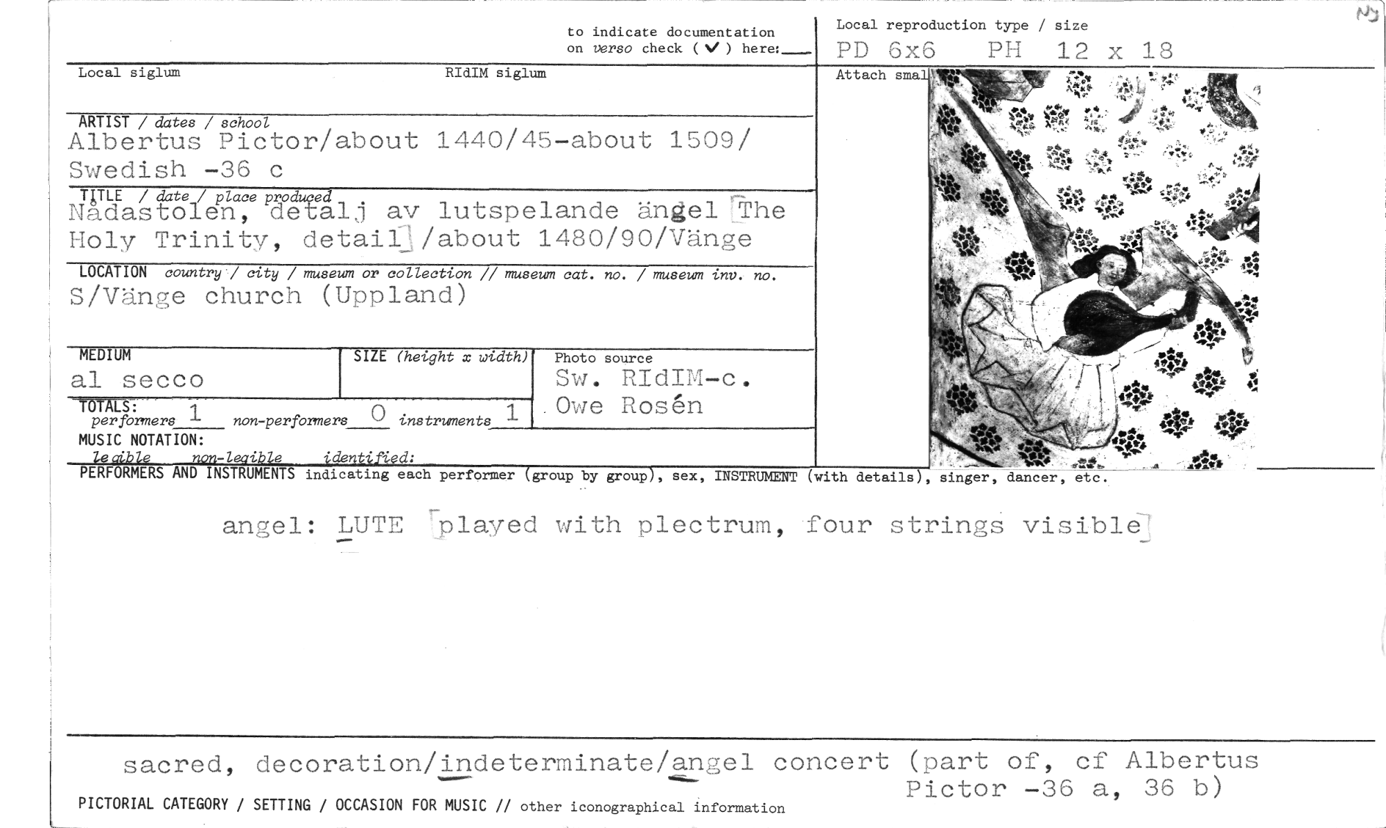 //// to indicate documentation //// on verso check (V) here: //// Local reproduction type / size //// PD 6x6 PH 12 x 18 //// Local siglum RIdIM siglum //// ARTIST / dates / school //// Albertus Pictor/about 1440/45-about 1509/ Swedish -36 c //// TgTLE / date / place produced_ //// Nadastolen, detalj av lutspelande ängel rThe Holy Trinity, detailA/about 1480/90/Vänge //// LOCATION country / city / museum or collection // museum cat. no. / museum tnv. no. //// S/Vänge church (Uppland) //// SIZE (height x width) //// MÅLS: //// per formers 1 non-performers 0 instruments //// MUSIC NOTATION: //// lecible non-leaible identified; //// PERFORMERS AND INSTRUMENTS indicating each performer (group by group), sex, INSTRUMENT //// MEDIUM //// al secco //// Photo source //// Sw. RIdIM-c. Owe Rosen //// Attach smal //// (with details), singer, dancer, etc. //// angel: LUTE rplayed with plectrum, four strings visible7 //// sacred, decoration/indeterminate/angel concert (part of, cf Albertus //// Nes. //// Pictor -36 a, 36 b) //// PICTORIAL CATEGORY / SETTING / OCCASION FOR MUSIC // other iconographical information ////