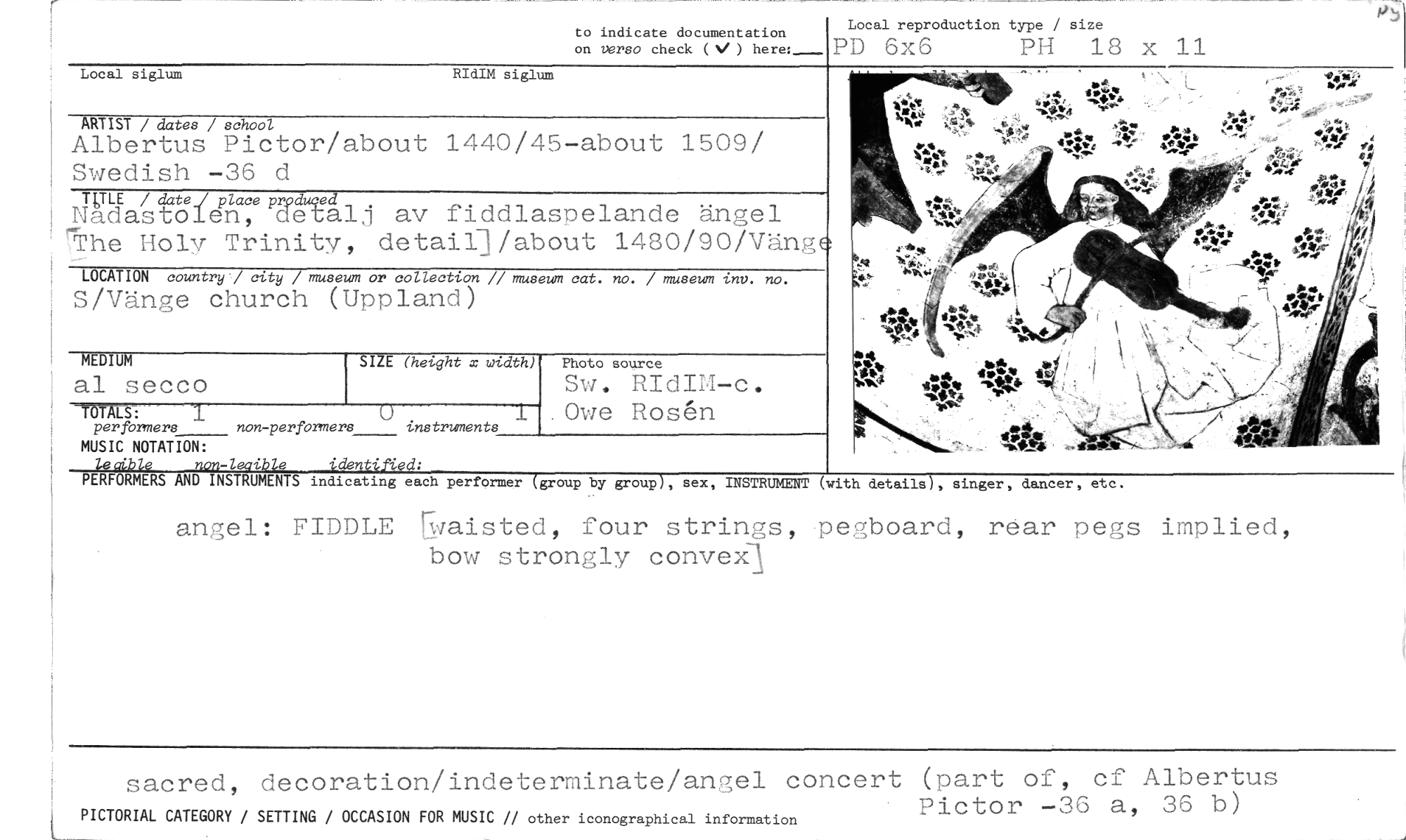 //// N //// to indicate documentation Local reproduction type / size //// on versa check (V) here:_ PD 6x6 PH 18 x 11 //// Local siglum RIdIM siglum //// ARTIST / dates / school //// Albertus Pictor/about 1440/45-about 1509/ Swedish -36 d //// TIJLE / date} place produced //// Nadastolen, detalj av fiddlaspelande ängel ,The Holy Trinity, detail]/about 1480/90/Väng //// LOCATION country ] city / museum or collection // museum cat. no. / museum 'om no. //// S/Vänge church (Uppland) //// SIZE (height x width) //// MAB: 1 //// per formers non-performers instruments //// MUSIC NOTATION: //// aible non-leaible identified: //// PERFORMERS AND INSTRUMENTS indicating each performer (group by group), sex, INSTRUMENT (with details), singer, daner, etc. //// angel: FIDDLE [yaisted, Cour strings, pegboard, rear pegs bow strongly conveXA //// MEDIUM //// al secco //// Photo source //// Sw. RIdIM-c. Owe Rosén //// implied, //// sacred, decoration/indeterminate/angel concert (part of, cf Albertus //// t_ PICTORIAL CATEGORY / SETTING / OCCASION FOR MUSIC // other iconographical information Pictor -36 a, 36 b) ////