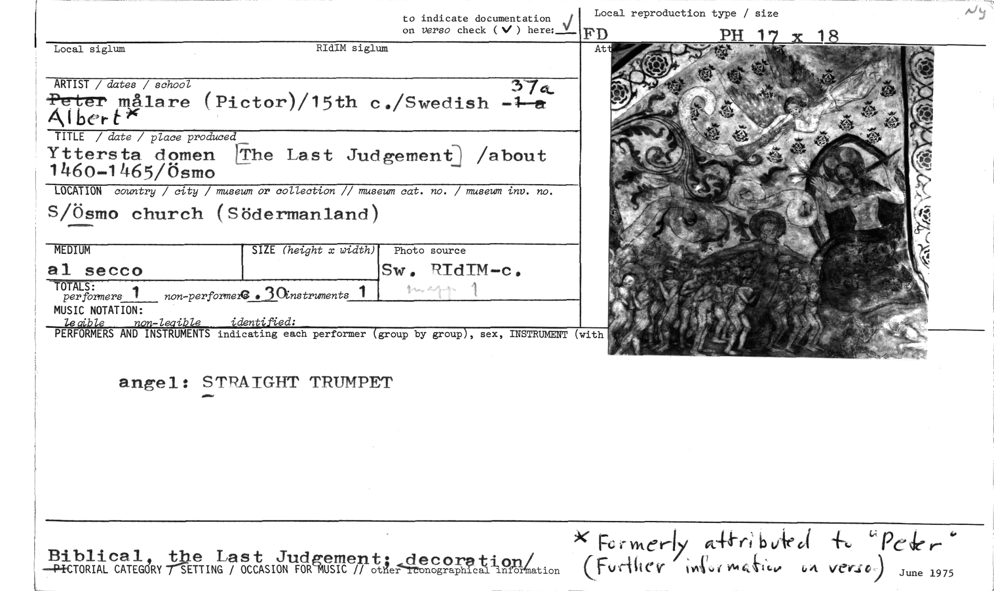 //// to indicate documentation //// on verso check (V) here:22_ //// Local reproduction type / size //// Local siglum RIdIM siglum //// PH 17 x 18 //// FD //// At //// ARTIST / dates / school 37Q. //// el målare (Pictor)/15th c./Swedish //// A i ber- t //// TITLE / date / place produced //// Yttersta domen Erhe Last Judgementj /about 1460 -1465/Ösm° //// LOCATION country / city / museum or collection // museum cat. no. / museum inv. no. //// S/Ösmo church (Södermanland) //// (4; //// p //// MEDIUM- //// al secco //// SIZE (height x width) Photo source //// TOTALS: //// per formers 1 non-performe213 .31Instruments 1 //// MUSIC NOTATION: //// Sw. RIdIM -c. //// 1 //// -/ i //// PERFORMERS AND INSTR //// NTS indicating each performer group by group , sex, INSTRUMENT (with //// angel: STRAIGHT TRUMPET //// K Fe r vh e k- ot.44-6 b vie d + Pe " //// Biblical, the Last Judgement• decorationi //// —PfCTORIAL CATEGORY 'SETT ING / OCCASION FOR SIC // otIterl‘tronographical inro-~tion (Fu d it C V' ;1441vi"&k""t 4,1` h4 Ver-(0) june 1975 ////