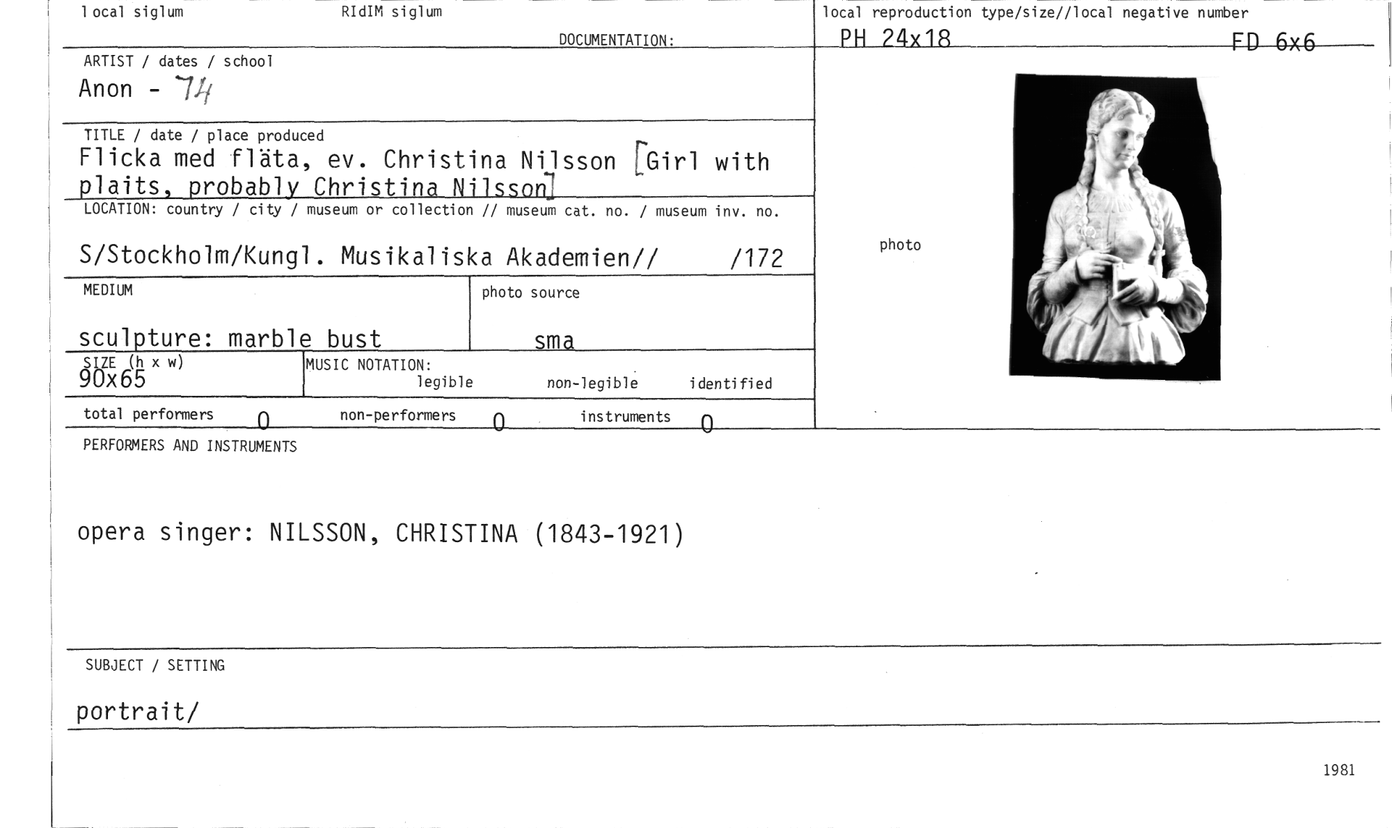 //// DOCUMENTATION: //// local reproduction type/size//local negative nurober //// PH 24x12 FD 6x6 //// 1 ocal siglum RIdIM siglum //// ARTIST / dates / school //// Anon - 7J //// TITLE / date / place produced //// Flicka med fläta, ev. Christina Nilsson [Girl with //// plaits, probably Christina Nilsson] //// LOCATION: country / city / museum or collection // museum cat. no. / museum inv. no. //// S/Stockholm/Kungl. Musikaliska Akademien// /172 //// MEDIUM //// sculpture: marble bust //// SIZE (h x w) //// 90x65 //// photo source //// sma //// MUSIC NOTATION: //// legible non-legible identified //// photo //// total performers 0 //// non-performers instruments 0 //// PERFORMERS AND INSTRUMENTS //// opera singer: NILSSON, CHRISTINA (1843-1921) //// SUBJECT / SETTING //// portrait/ //// 1981 ////