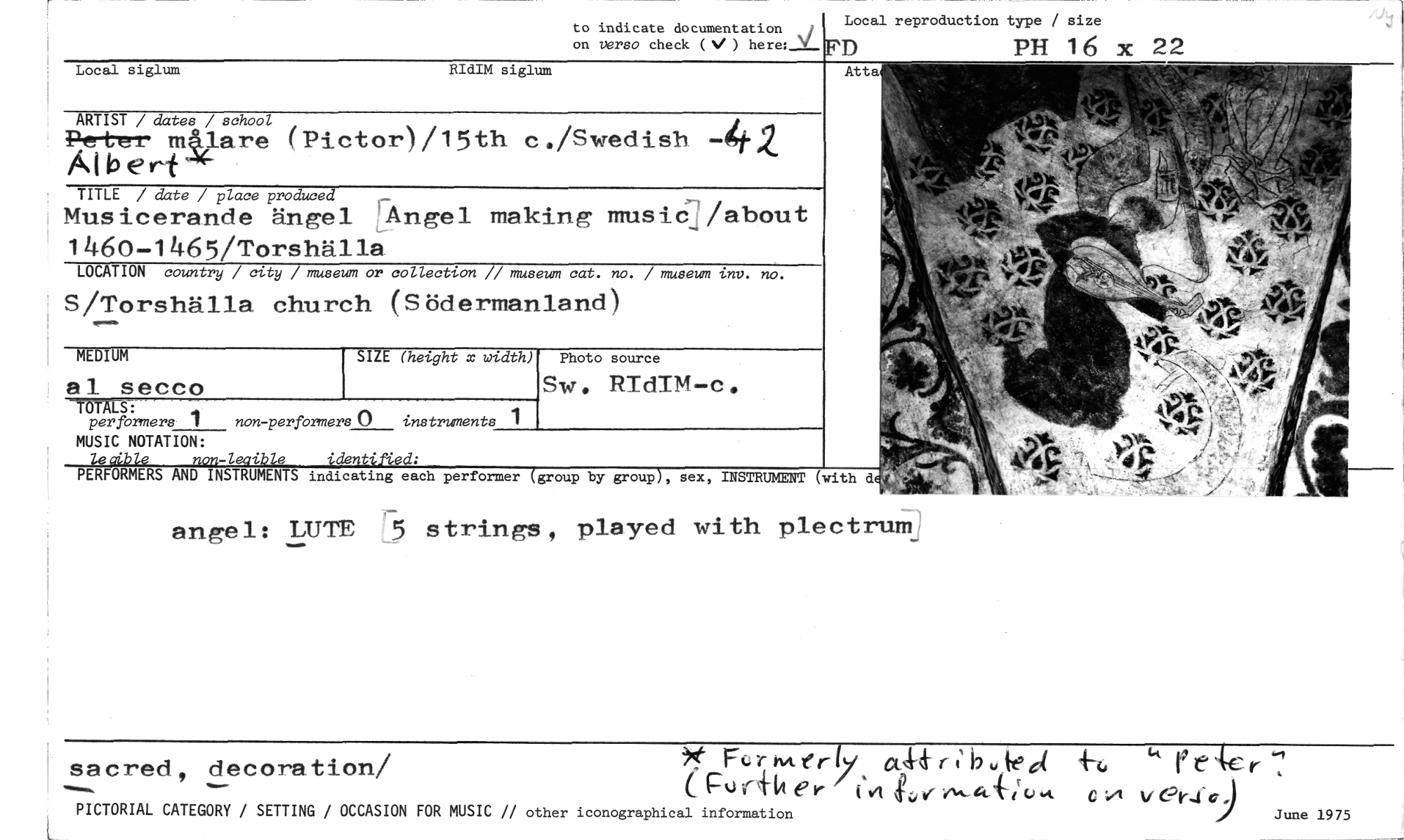 //// angel: LUTE 5 stringe, played with plectrum //// 3.'t Fe r e r-51 exa r b . te c( +- "k r //// ( er L, c v, v 61-4- //// PICTORIAL CATEGORY / SETTING / OCCASION FOR MUSIC // other iconographical information //// 9 //// June 1975 //// Atta //// 22 //// to indicate documentation ./ on verso check (V ) here:_3L- //// Local reproduction type / size //// FD PH 16 x //// oC2,‹ ' //// RIdIM siglum //// Local siglum //// ARTIST / dates / school //// gebe. målare (Pictor)/15th c,/Swedish //// Aber //// TITLE / date / place produced //// Musicerande ängel 'Angel making music:/about //// 146o-1465/Torshälla //// LOCATION country / city / museum or collection // museum cat. no. / museum inv. no. //// S/Torshälla church (Södermanland) //// MEDIUM //// al secco //// SIZE (heyght x width) //// Photo source //// Sw. RIdIM-c. //// per formers 1 non-performers 0 instruments 1 //// MUSIC NOTATION: //// -/ 1. e 'den 'ed: //// PERFORMERS AND INSTRUMENTS indicating each performer //// group by group , sex, INSTRUMENT (with d //// sacred, decoration/ ////
