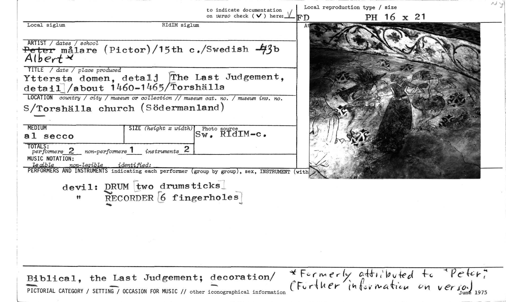//// devil: DRUM two drumsticks //// r //// tt RECORDF,R 6 fingerholes //// Bibli ca.1 , the Last Judgement; e (y. <>ra it i c) 4E F7 r 64 e r 15( 4.4d7i i' 0 ,Ldit, 4 4-e 419e k //// i - //// I r-I vt e' r 4-1,k, vh v er .co.,) //// PICTORIAL CATEGORY / SETTING / OCCASION FOR MUSIC // other iconographical information Jun 1975 //// to indicate documentation i on verso check (V ) here: V //// Local reproduction type / size //// FD PH 16 x 21 //// Local siglum RIdIM siglum //// ARTIST / dates / school , //// -Cer målare ( Piet or) /15 th c./Swedish -3b A I b ert -4 //// TITLE / date / place produced //// Yttersta domen, detalj ;the Last Judgement de ta il bout 1460-1465 Torshälla //// LOCATION country / city / museum or collection // museum cat. no. //// S/Torshäl la church (S öd erman land ) //// museum inv. no. //// SIZE (hetght x xtdth) //// swPho.to //// TOTALST //// per formers 2 non-performers 1 instruments 2 //// MUSIC NOTATION: //// lecible non-ledible identified: //// PERFORMERS AND INSTRUMENTS indicating each performer //// group by group , sex, INSTRUMENT (with //// MEDIUM //// a 1 secco ////