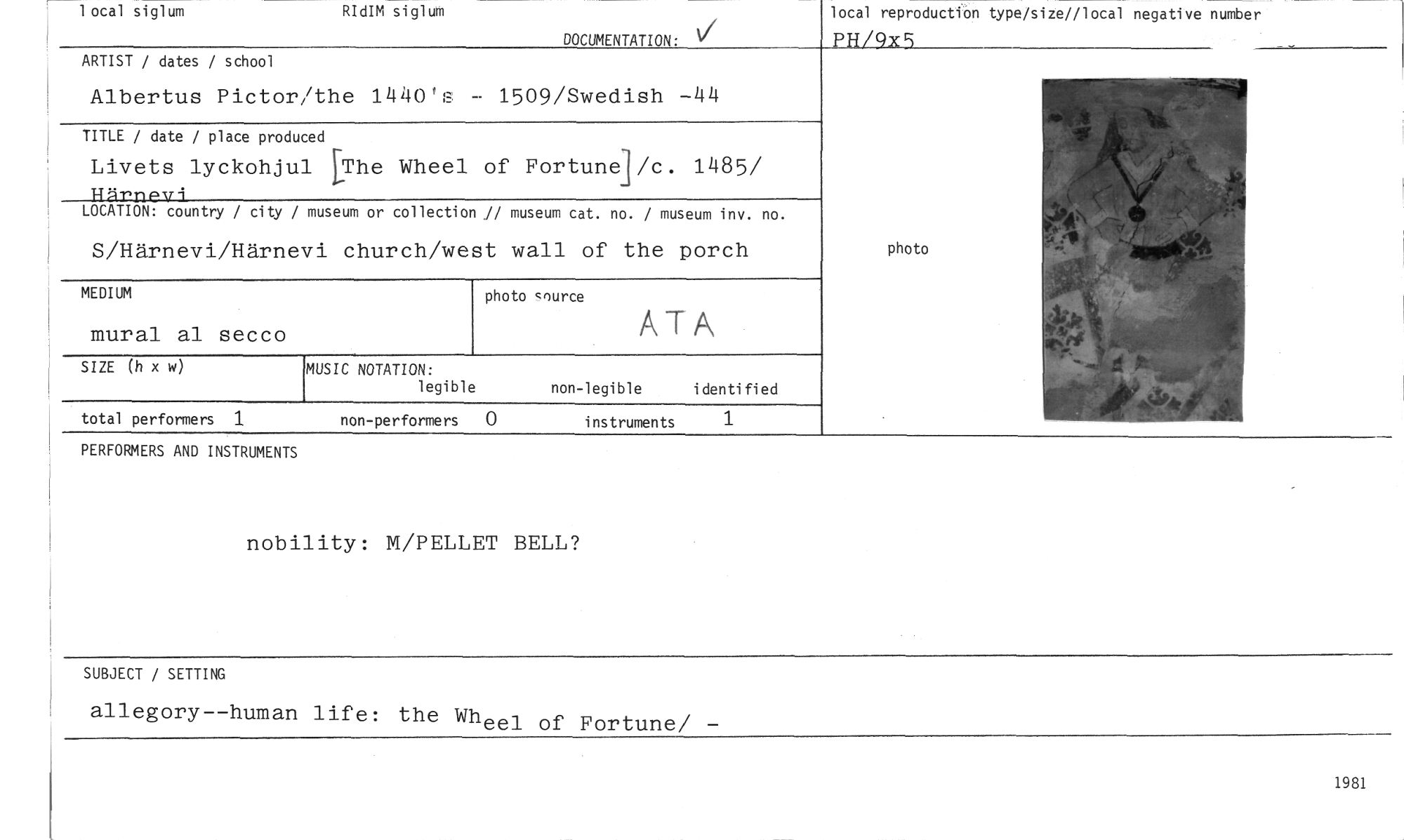 //// 1 ocal siglum RIdIM siglum DOCUMENTATION: local reproductiOn type/size//local negatiVe number //// /(41E9 //// //// PERFORMERS AND INSTRUMENTS //// nobility: M/PELLET BELL? //// SUBJECT / SETTING //// allegory--human life: the Wheel of Fortune/ - //// ARTIST / dates / school //// Albertus Pictor/the 1440's — 1509/Swedish —44 //// TITLE / date / place produced //// Livets lyckohjul [The Wheel of FortunePc. 1485/ mäprevi //// LOCATION: country / city / museum or collection 1/ museum cat. no. / museum inv. no. //// S/Härnevi/Härnevi church/west wall of the porch //// photo snurce //// mural al secco //// SIZE (h x w) //// non-legible identified //// total performers 1 non-performers 0 instruments 1 //// MEDIUM //// MUSIC NOTATION: //// legible //// ATA //// photo //// 1981 ////
