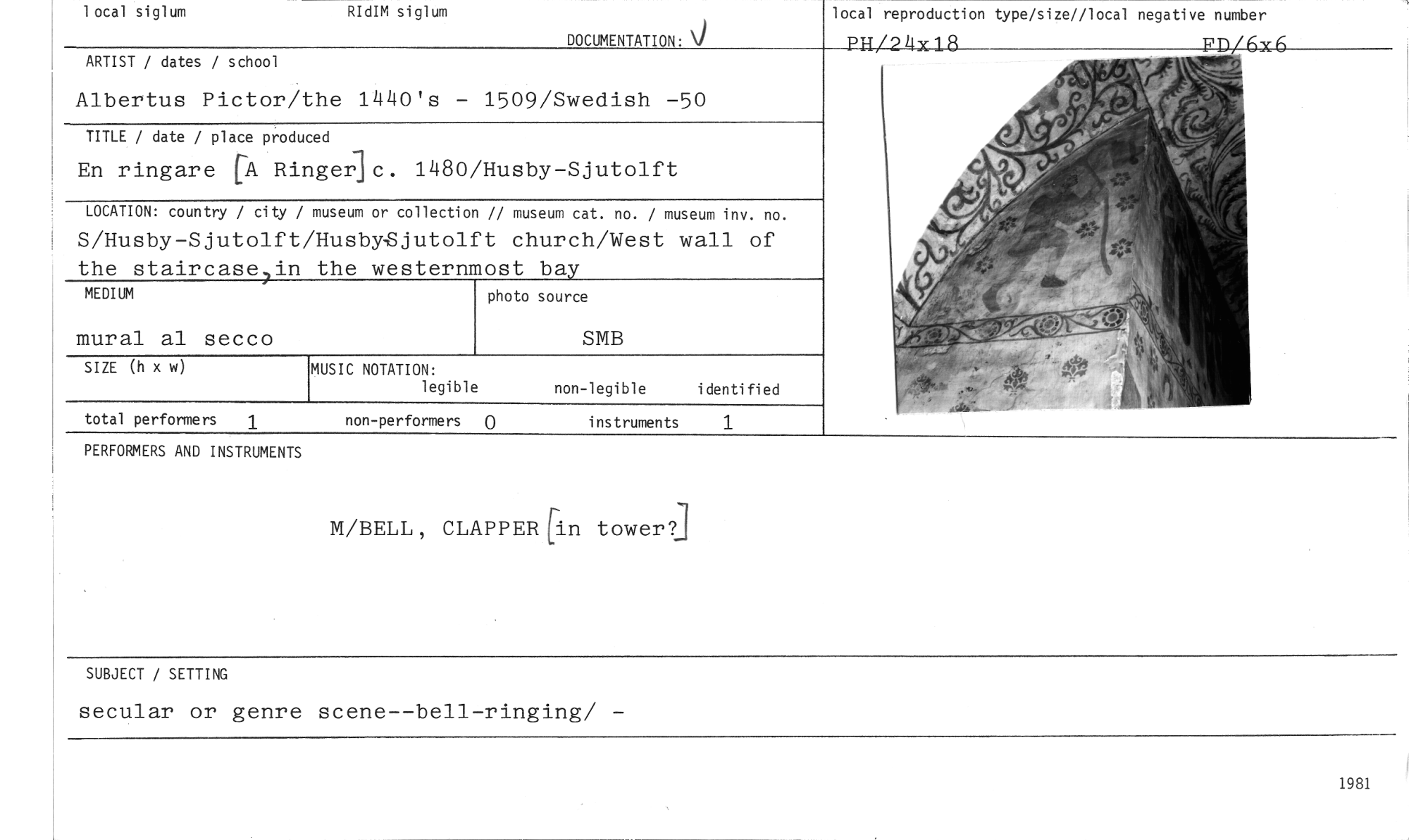 //// 1 ocal siglum RIdIM siglum //// DOCUMENTATION: \./ //// local reproduction type/size//local negative number //// PF/24x18 FD/6x6 //// ARTIST / dates / school //// Albertus Pictor/the 1440's - 1509/Swedish -50 //// TITLE / date / place produced //// En ringare [A Ringer]c. 1480/Husby-Sjutolft //// LOCATION: country / city / museum or collection // museum cat. no. / museum inv. no. //// S/Husby-Sjutolft/HusbySjutolft church/West wall of the staircase7in the westernmost bay //// MEDIUM //// SMB //// SIZE (h x w) //// non-legible identified //// total performers 1 non-performers 0 instruments 1 //// mural al secco //// MUSIC NOTATION: //// legible //// photo source //// PERFORMERS AND INSTRUMENTS //// M/BELL, CLAPPER(in towerj //// SUBJECT / SETTING //// secular or genre scene--bell-ringing/ - //// 1981 ////