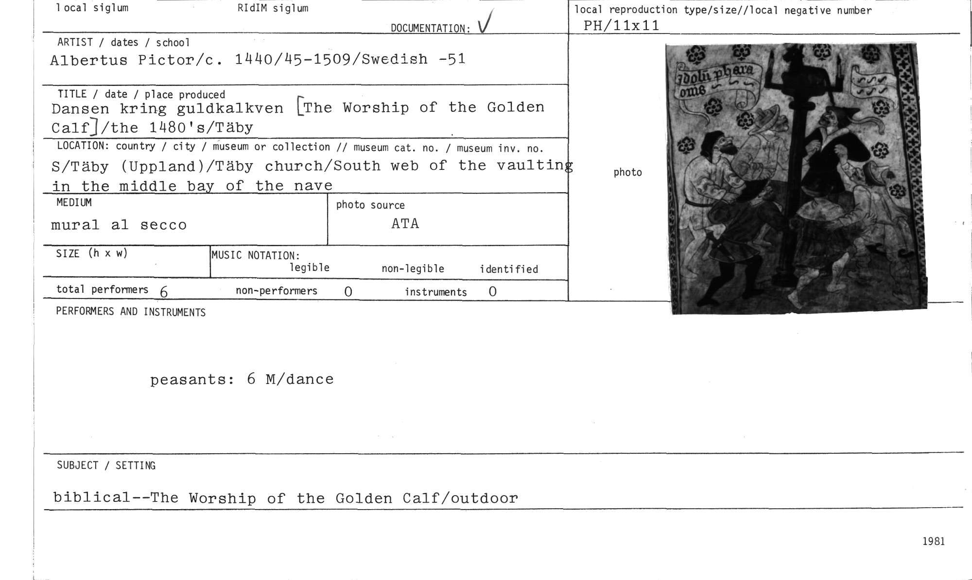 //// 1 ocal siglum //// RIdIM siglum //// DOCUMENTATION: V //// local reproduction type/size//local negative number //// PH/11x11 //// ARTIST / dates / school //// Albertus Pictor/c. 1440/45-1509/Swedish -51 //// 722--INke //// TITLE / date / place produced //// Dansen kring guldkalkven [The Worship of the Golden CalfJ/the 1480's/Täby //// LOCATION: country / city / museum or collection // museum cat. no. / museum inv. no. //// S/Täby (Uppland)/Täby church/South web of the vaultin //// in the middle bay of the nave //// MEDIUM photo source //// mural al secco ATA //// photo //// SIZE (h x w) //// MUSIC NOTATION: //// legible //// non-legible identified //// total performers 6 //// instruments 0 //// PERFORMERS AND INSTRUMENTS //// peasants: 6 M/dance //// SUBJECT / SETTING //// biblical--The Worship of the Golden Calf/outdoor //// 1981 ////
