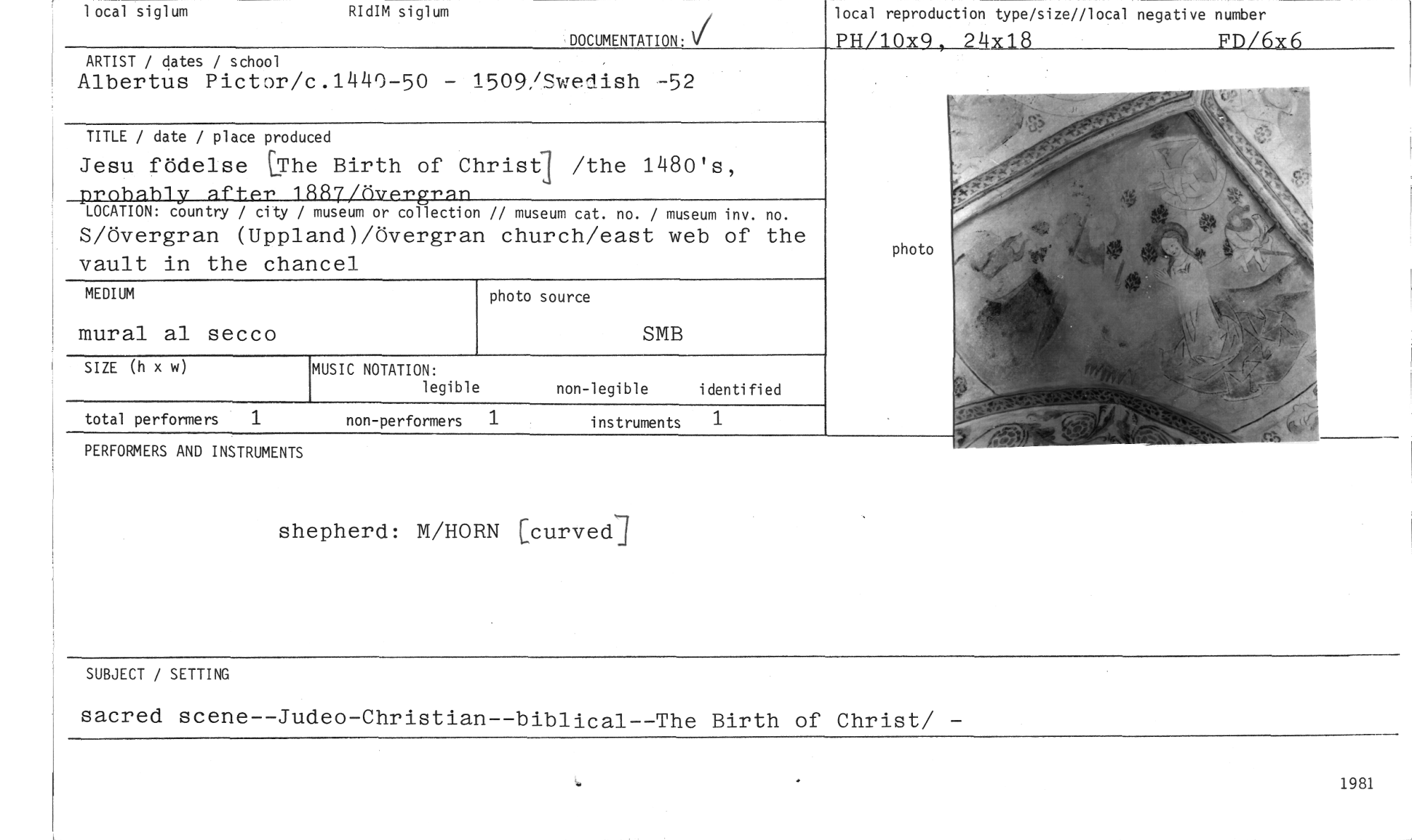 //// 1 ocal siglum //// RIdIM siglum //// DOCUMENTATION: //// local reproduction type/size//local negative number PH/10x9, 24x18 FD/6x6 //// ARTIST / dates / school //// Albertus Pictor/c.1440-50 - 1509/Swedish -52 //// TITLE / date / place produced //// Jesu födelse Uhe Birth of Christ] /the 1480's, //// . 811.8 . //// •- • //// LOCATION: country / city / museum or collection // museum cat. no. / museum inv. no. //// S/övergran (Uppland)/övergran church/east web of the vault in the chancel //// photo //// MEDIUM //// photo source //// mural al secco //// SMB //// SIZE (h x w) //// MUSIC NOTATION: //// legible //// non-legible identified //// instruments 1 //// PERFORMERS AND INSTRUMENTS //// shepherd: M/HORN [turved] //// SUBJECT / SETTING //// sacred scene--Judeo-Christian--biblical--The Birth of Christ/ - //// 1981 ////