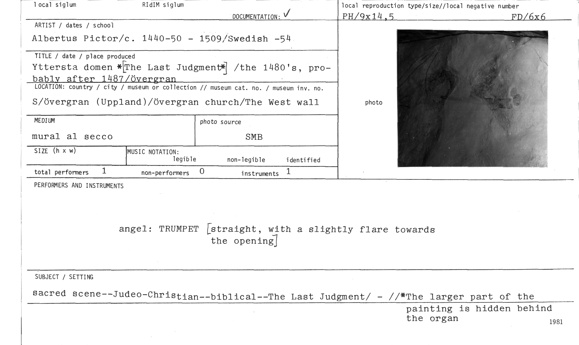 //// local reproduction type/size//local negative number //// PH/9x14.5 FD/6x6 //// local siglum RIdIM siglum //// DOCUMENTATION: //// 1 //// 0 //// total performers 1 //// non-performers //// instruments //// photo //// ARTIST / dates / school //// Albertus Pictor/c. 1440-50 - 1509/Swedish -54 //// TITLE / date / place produced //// Yttersta domen 3fl'he Last Judgment49 /the 1480's, pro- //// bably after 1487/övergran //// LOCATION: country / city / museum or collection // museum cat. no. / museum inv. no. //// S/övergran (Uppland)/övergran church/The West wall //// photo source //// mural al secco //// SIZE (h x w) //// non-legible identified //// MEDIUM //// MUSIC NOTATION: //// legible //// SMB //// PERFORMERS AND INSTRUMENTS //// angel: TRUMPET [straight, with a slightly flare towards the openingj //// SUBJECT / SETTING //// sacred scene--Judeo-Christian--biblical--The Last Judgment/ - //*The larger part of the //// painting is hidden behind the organ 1981 ////