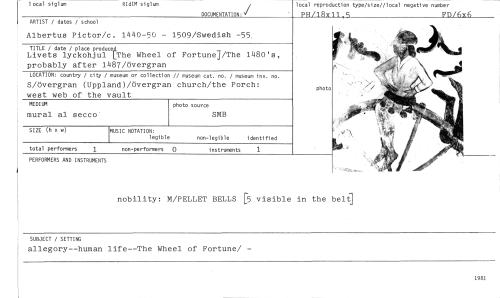 //// local siglum //// RIdIM siglum //// local reproduction type/size//local negative number //// 1n4//1 85(1 i ,5 //// DOCUMENTATION: //// ARTIST / dates / school //// Albertus Pictor/c. 1440-50 — 1509/Swedish -55, //// TITLE / date / place producel //// Livets lyckohjul [The Wheel of Fortuneg/The 1480's, probably after 1487/övergran //// LOCATION: country / city / museum or collection // museum cat. no. / museum inv. no. //// S/övergran (Uppland)/övergran church/the Porch: west web of the vault //// MEDIUM photo source //// mural al secco SMB //// SIZE (h x w) MUSIC NOTATION: non-legible identified //// legible //// total performers 1 non-performers 0 instruments 1 //// PERFORMERS AND INSTRUMENTS //// nobility: M/PELLET BELLS [5 visible in the helt] //// SUBJECT / SETTING //// allegory--human life--The Wheel of Fortune/ — //// 1981 ////