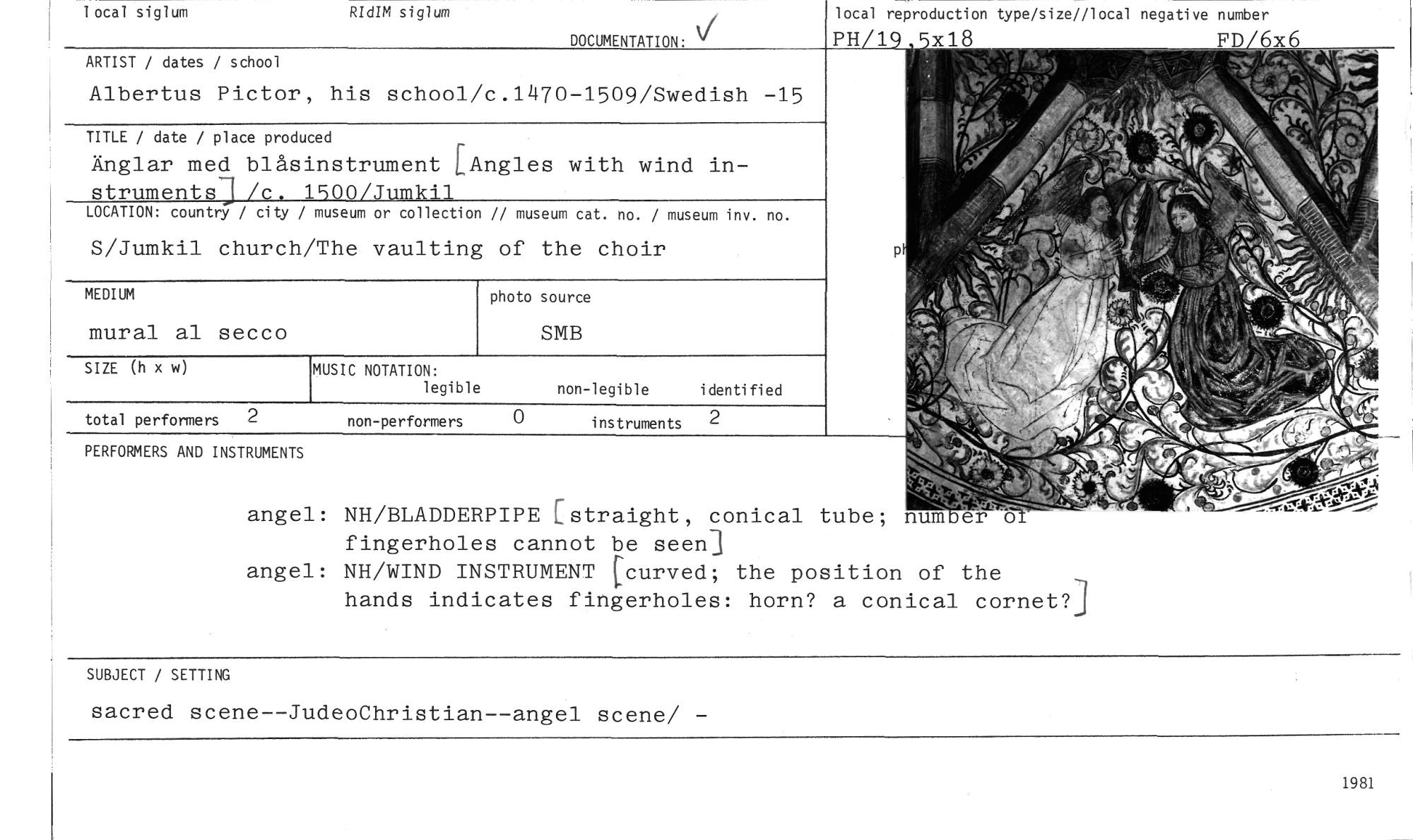//// total performers 2 //// non-performers 0 instruments 2 //// 1 ocal siglum //// RIdIM siglum //// DOCUMENTATION: //// PERFORMERS AND INSTRUMENTS //// angel: NH/BLADDERPIPE [straight, conical tube; num er'l-ört fingerholes cannot be seen] //// angel: NH/WIND INSTRUMENT [curved; the position of the //// hands indicates fingerholes: horn? a conical cornet?J //// SUBJECT / SETTING //// sacred scene--JudeoChristian--angel scene/ - //// 1981 //// local reproduction type/size//local negative number //// PH 1•x18 FD 6x6 //// ARTIST / dates / school //// Albertus Pictor, his school/c.1470-1509/Swedish —15 //// TITLE / date / place produced //// Änglar med blåsinstrument [Angles with wind instrumentsj /c. 1500/Jumkil //// LOCATION: country / city / museum or collection // museum cat. no. / moeuminv. no. //// S/Jumkil church/The vaulting of the choir //// SIZE (h x w) //// MUSIC NOTATION: //// legible //// non-legible identified //// MEDIUM //// mural al secco //// photo source //// SMB ////
