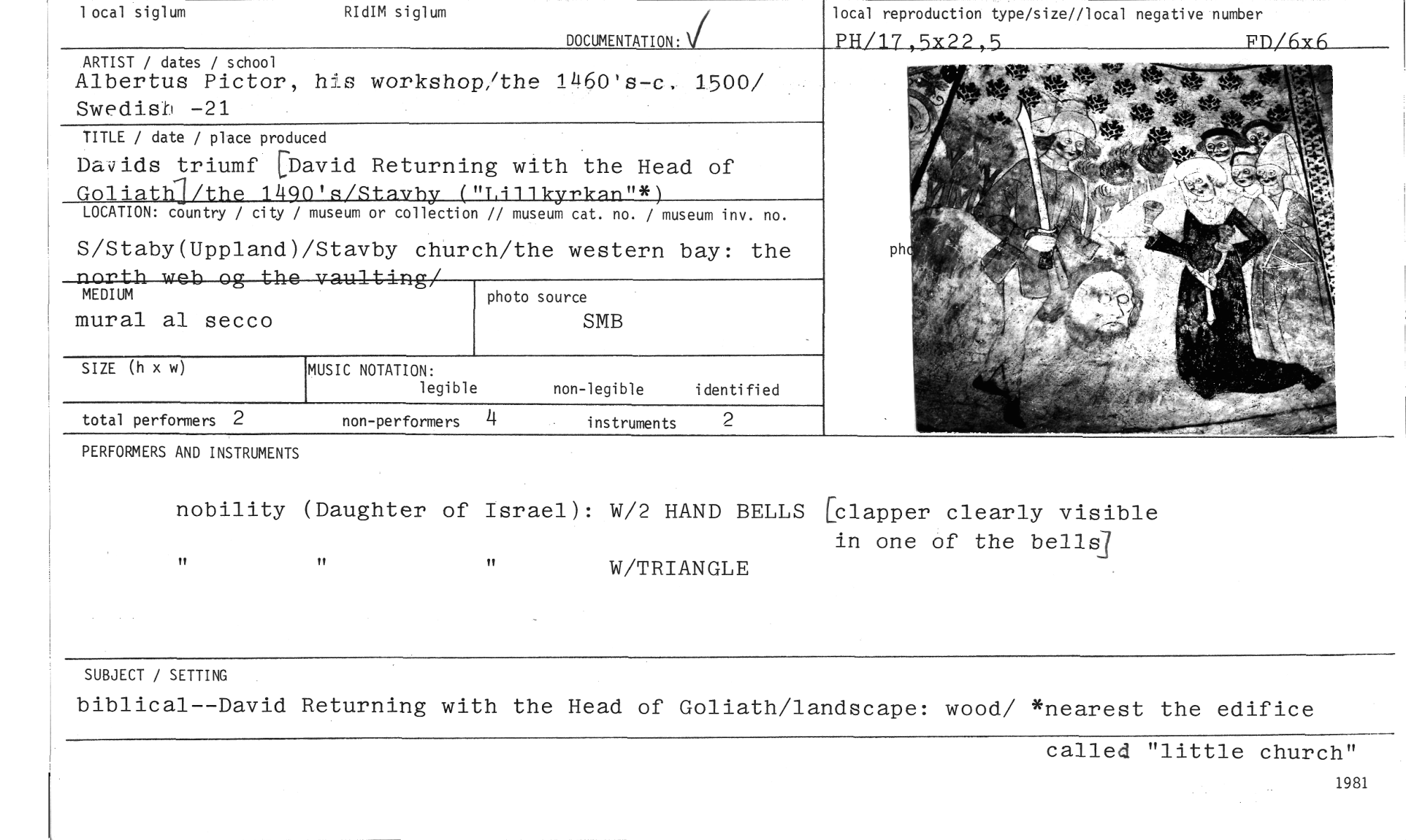 //// 1 ocal siglum //// RIdIM siglum //// DOCUMENTATION: //// local reproduction type/size//local negative number PH/17,5x22,5 Pn/6Y£L //// ARTIST / dates / school //// Albertus Pictor, his workshop/the 1460's-c, 1500/ Swedish -21 //// TITLE / date / place produced //// Davids triumf [David Returning with the Head of GOliathj/the 1490's/StsvIly ("Lillkyrkan"*) //// LOCATION: country / city / museum or collection // museum cat. no. / museum inv. no. //// S/Staby(Uppland)/Stavby church/the western bay: the //// nortb web og the vaulting/ //// MEDIUM photo source //// mural al secco SMB //// 1RS, "1:Nh //// ph //// SIZE (h x w) //// MUSIC NOTATION: //// legible //// non-legible identified //// total performers 2 non-performers 4 //// PERFORMERS AND INSTRUMENTS //// nobility (Daughter of Israel): W/2 HAND BELLS [clapper clearly visible //// in one of the bens/ //// W/TRIANGLE //// SUBJECT / SETTING //// biblical--David Returning with the Head of Goliath/landscape: wood/ *nearest the edifice //// called "little church" //// 1981 ////