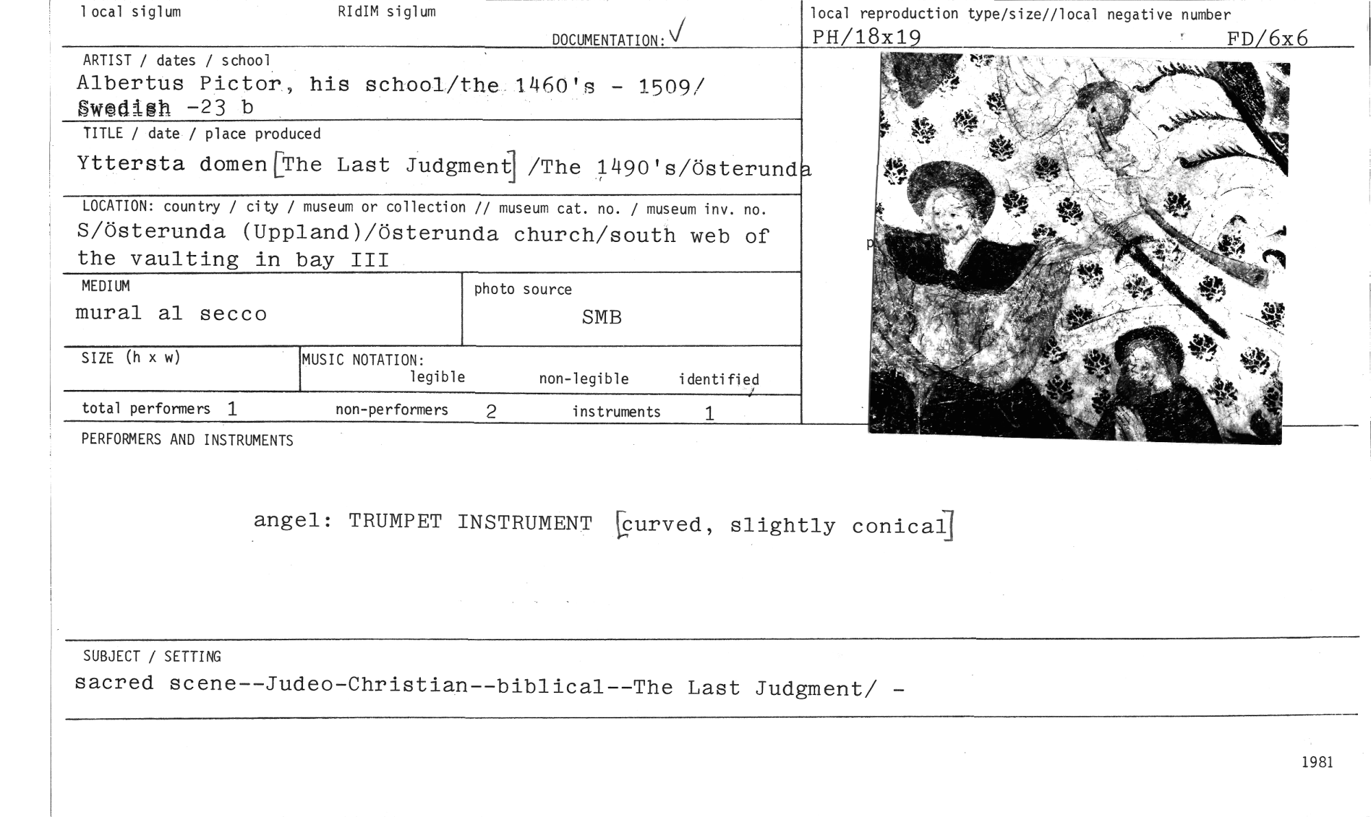 //// 1981 //// local reproduction type/size//local negative number //// PH/18x19 FD/6x6 //// DOCUMENTATION: //// ARTIST / dates / school //// Albertus Pictor, his school/the.1460's - 1509/ SWO.digl -23 b //// TITLE / date / place produced //// Yttersta domen[The Last Judgmenfl /The 1490's/österunda //// LOCATION: country / city / museum or collection // museum cat. no. / museum inv. no. //// S/österunda (Uppland)/österunda church/south web of the vaulting in bay III //// MEDIUM //// mural al secco //// SIZE (h x w) //// MUSIC NOTATION: //// legible //// photo source //// non-legible identified //// - Nr" //// 4K -1 //// total performers 1 //// PERFORMERS AND INSTRUMENTS //// non-performers 2 instruments 1 //// angel: TRUMPET INSTRUMENT curved, slightly conical] //// RIdIM siglum //// 1 ocal siglum //// SMB //// SUBJECT / SETTING //// sacred scene--Judeo-Christian--biblical--The Last Judgment/ - ////