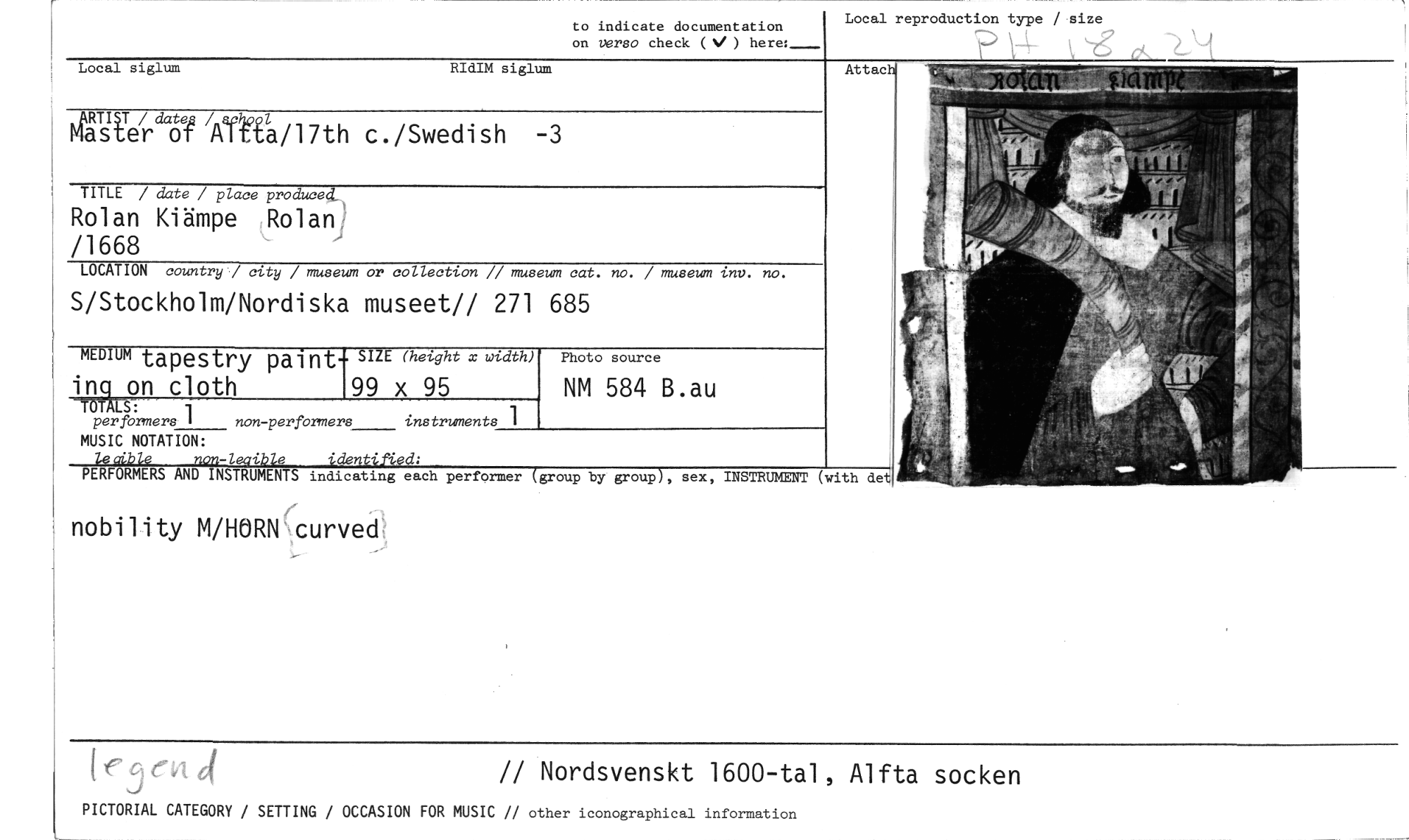 //// ['ej ni j // Nordsvenskt 1600-tal, Alfta socken //// PICTORIAL CATEGORY / SETTING / OCCASION FOR MUSIC // other iconographical information //// to indicate documentation on verso check (V ) //// Local siglum RIdIM siglum //// Pete/rdWAYklia/17th c./Swedish -3 //// TITLE / date / place produce41, //// Rolan Kiämpe Rolan /1668 //// LOCATION country / city / museum or collection // museum cat. no. / museum inv. no. //// S/Stockholm/Nordiska museet// 271 685 //// Local reproduction type / size //// Attacil //// MEDIUM tapestry paint- SIZE (height x width) //// in g on cloth //// OTALS: 99 x 95 //// per formers 1 non-performers instruments 1 //// Photo source //// NM 584 B.au //// MUSIC NOTATION: //// le aible non-leaible //// PERFORMERS AND INSTRUMENTS indicating each performer (group by group), sex, //// nobility M/HORN curved //// INSTRUMENT (with de ////