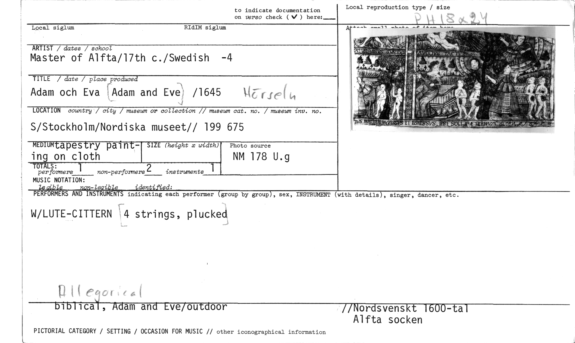 //// to indicate documentation //// on verso check ( ) here:- //// Local siglum RIdIM siglum //// ARTIST / dates / school //// Master of Alfta/17th c./Swedish -4 //// TITLE / date / place produced //// Adam och Eva Adam and Eve; /1645 VG7:11.C, //// LOCATION country ./ city / museum or collection // museum cat. no. / museum inv. no. //// S/Stockholm/Nordiska museet// 199 675 Local reproduction type / size //// SVSAPSI:SOLlår //// MEDIUM tapestry paint- //// ing on cloth //// SIZE (height x width) //// -«'Lt"1 //// per formers non-performers 2 instruments 1 Photo source //// NM 178 U.g //// MUSIC NOTATION: //// non-leaibje identified: //// PERFORMERS AND INSTRUMENTS indicating each performer (group by group), //// W/LUTE-CITTERN 4 strings, plucked, //// sex, INSTRUMENT (with details), singer, dancer, etc. //// biblica , Adam and Eve/outdoor //Nordsvenskt 1600-tal //// Alfta socken //// PICTORIAL CATEGORY / SETTING / OCCASION FOR MUSIC // other iconographical information ////