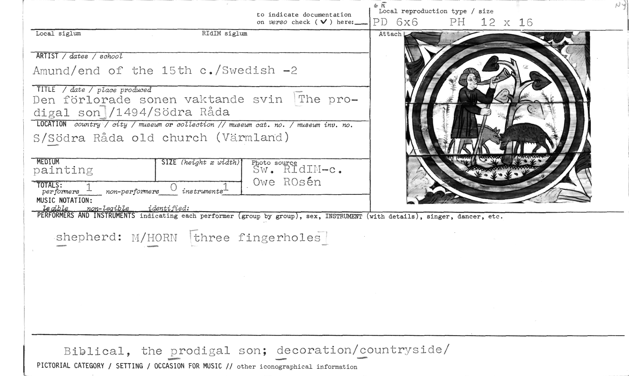 //// to indicate documentation Local reproduction type / size //// on versa check ( ) here:_ PD 6x6 //// PH 12 x 16 //// Local siglum RIdIM siglum //// ARTIST / dates / school //// Amund/end of the 15th c./Swedish -2 //// TITLE / date / place produced //// Den förlorade sonen vaktande svin )The pro-digal son/1494/Södra Råda //// LOCATION country] city / museum or collection // museum cat. no. / museum inv. no. //// S/Södra Råda old church (Värmland) //// SIZE (height x width) //// MALS: //// per formers 1 non-perforners 0 instrument //// MUSIC NOTATION: //// if4Kkle non-leggle identified: //// PERFORMERS AND INSTRUMENTS indicating each performer (group by group), sex, INSTRUMENT //// shepherd: M/HORN rthree fingerholeSH //// MEDIUM //// painting //// Photo source //// Sw. RIdIM-c. Owe R0s6n //// Attach //// (with details), sånger, dancer, etc. //// Biblical, the prodigal son; decoration/countryside/ //// PICTORIAL CATEGORY / SETTING / OCCASION FOR MUSIC // other iconographical information ////