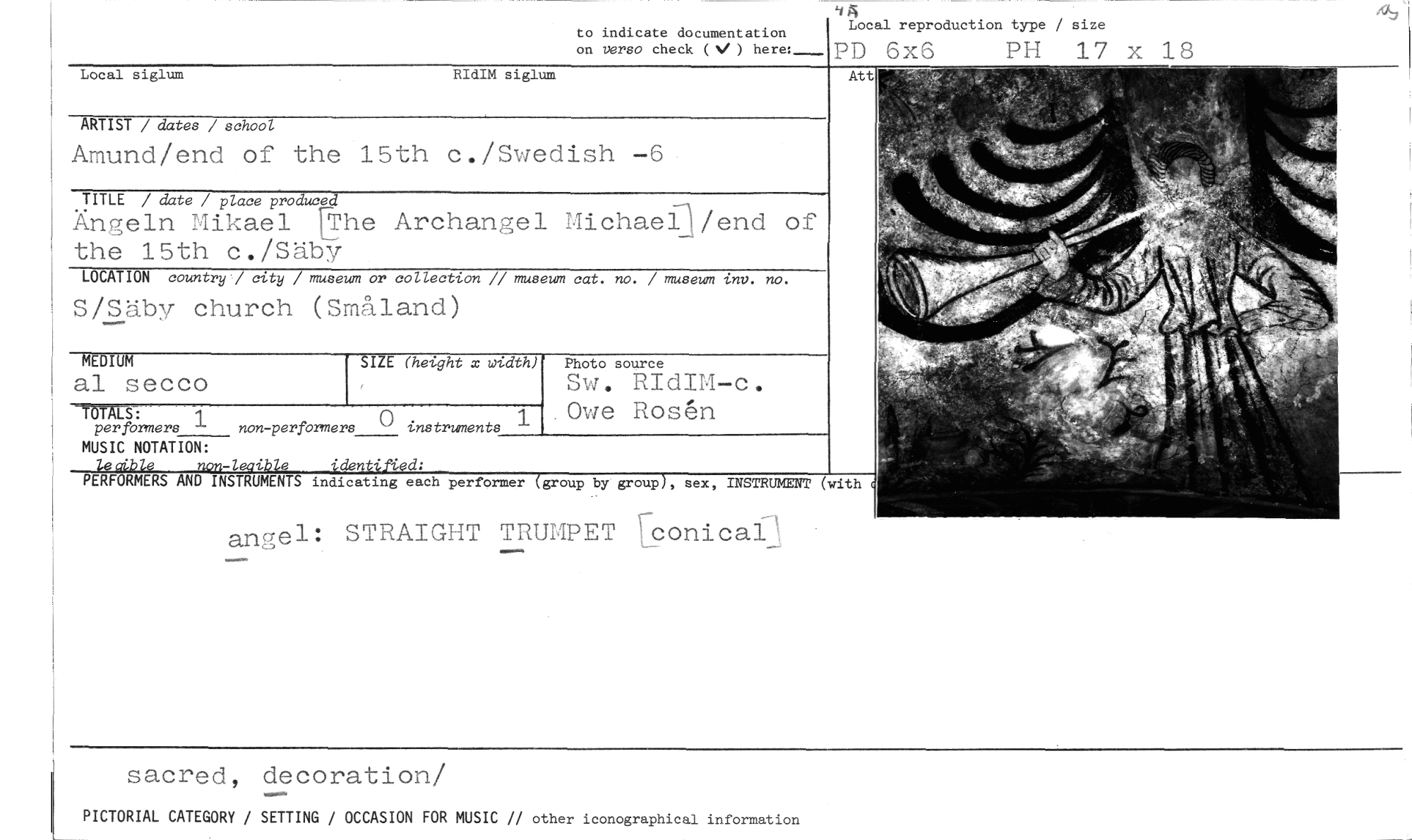 //// to indicate documentation on verso check (V ) here: //// 'In //// Local reproduction type / size //// PD 6x6 1-)T T. 17 //// Local siglum RIdIM siglum //// ARTIST / dates / school //// Amund/end of the 15th c./Swedish -6 //// TITLE / date / place produced //// Ängeln Mikael [The Archangel Michaefj/end of the 15th c./Säby //// LOCATION country / city / museum or collection // museum cat. no. / museum inv. no. //// S/Säby church (Småland) //// MEDIUM //// al secco //// SIZE (height x width) //// TÖTALS: //// per formers 1 non-performers () instruments 1 //// MUSIC NOTATION: //// leaible non-leaible identified: //// Photo source //// Sw. RIdIM-c. .Owe Rosén //// PERFORMERS AND INSTRUMENTS indicating each performer (group by group), sex, INSTRUMENT (with //// angel: STRAIGHT TRUMPET 5onicai3 //// sacred, decoration/ //// PICTORIAL CATEGORY / SETTING / OCCASION FOR MUSIC // other iconographical information ////