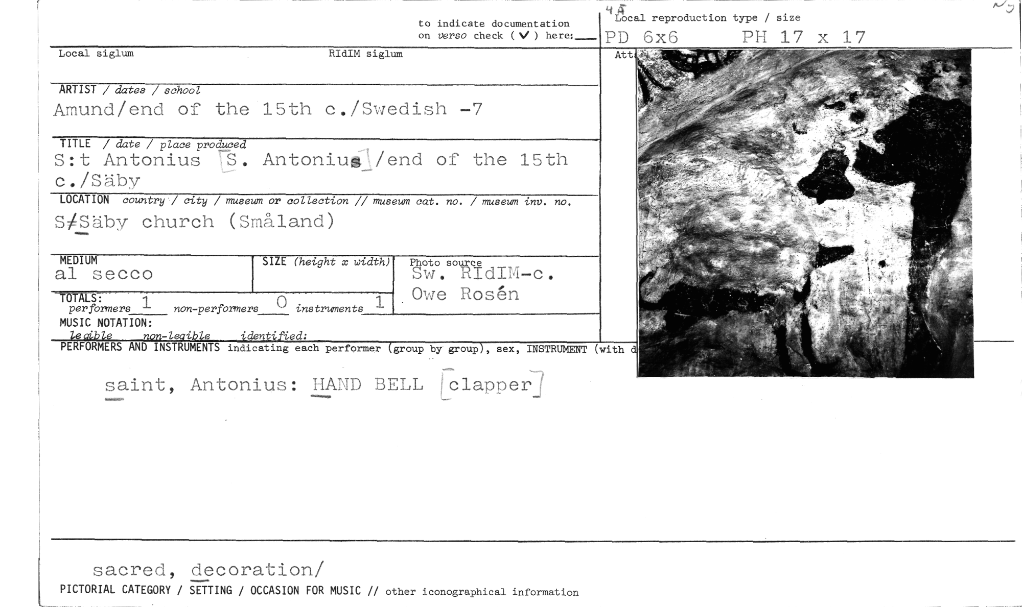 //// to indicate documentation //// on verso check (V ) here:_ //// 4- //// Local reproduction type / size //// PD 6x6 PH 17 x 17 //// Att //// Local siglum RIdIM siglum //// ARTIST / dates / school //// Amund/end of the 15th c./Swedish -7 //// TITLE / date / place produced //// S:t Antonius 7b. Antoniuällend of the 15th L.- //// c./Säby //// LOCATION country / city / museum or collection // museum cat. no. / museum tnv. no. //// SSäby church (Småland) //// MEDIUM //// al secco //// SIZE (height x width) //// Photo source //// Sw. RIdIM-c. Owe Rostin //// perfbrmers 1 non -perfbrmers () instruments //// MUSIC NOTATION: //// lecible identified: //// PERFORMERS ANII INSTRUMENTS indicating each performer (group by group), sex, INSTRUMENT //// (with d //// saint, Antonius: HAND BELL Lclapper2 //// sacred, decoration/ //// PICTORIAL CATEGORY / SETTING / OCCASION FOR MUSIC // other iconographical information ////
