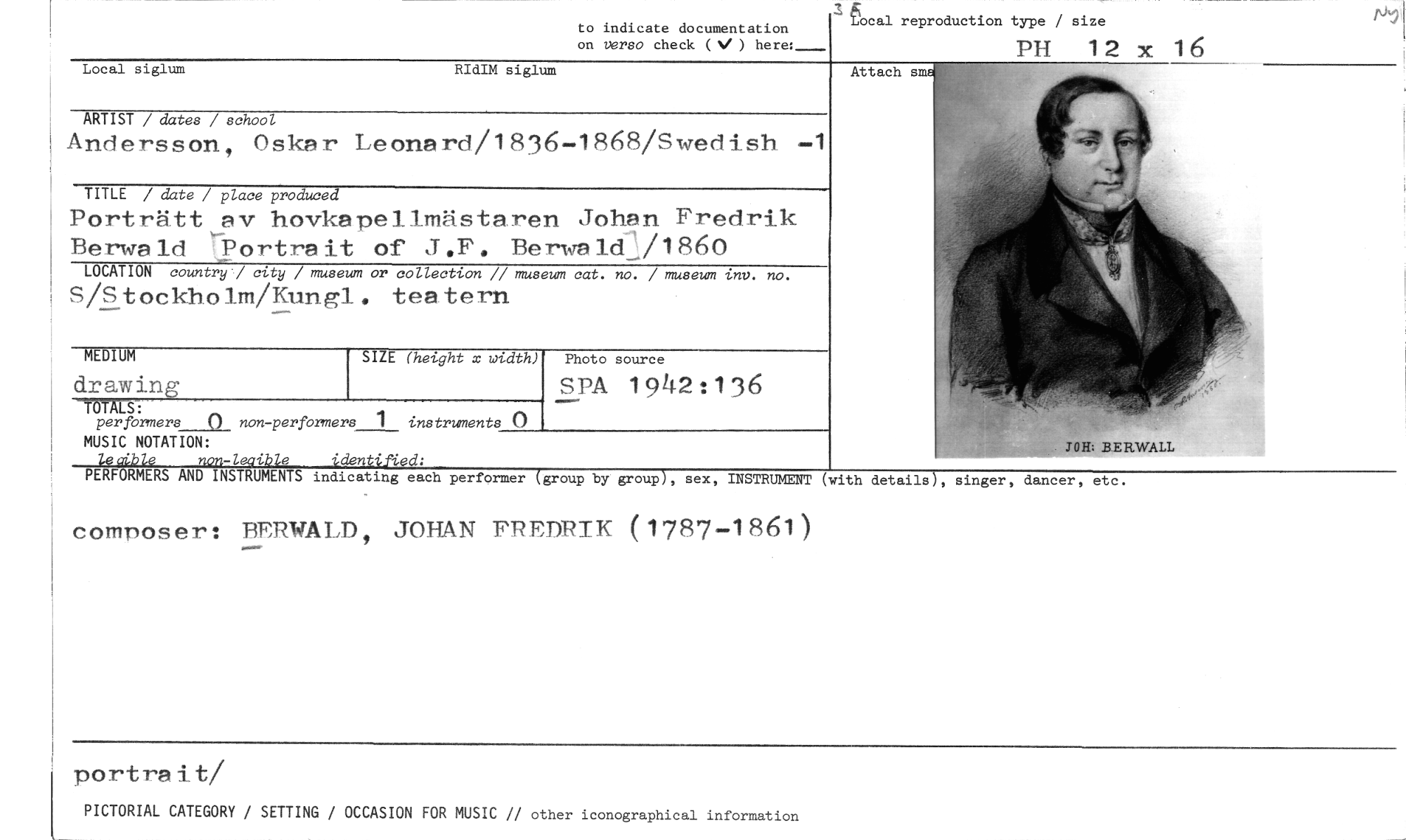 //// tocal reproduction type / size //// PH 12 //// x 16 //// to indicate documentation on verso check (V ) here; //// Local siglum RIdIM siglum //// ARTIST / dates / school //// Andersson, Oskar Leonard/1836-1868/Swedish - //// TITLE / date / place produced //// Porträtt av hovkapellmästaren Johan Fredrik Berwald rOortrait of J.F. Berwald /1860 //// LOCATION country / city / museum or collection // museum cat. no. / museum inv. no. //// S/Stockholm/Kungl. teatern //// MEDIUM //// TILLS: //// per formers 0 non-performers 1 instruments 0 MUSIC NOTATION: //// Zeoible non-leaible identified; //// PERFORMERS AND INSTRUMENTS indicating each performer (group by group), sex, INSTRUMENT (with details), //// composer: BERWALD, JOHAN FREDRIK (1787-1861) //// draw ing //// SIZE (height x width) //// Photo source //// SPA 1942:136 //// Attach s //// JOH, BERWALL //// singer, dancer, etc. //// T)0/71;TINiLlb/( //// PICTORIAL CATEGORY / SETTING / OCCASION FOR MUSIC // other iconographical information ////