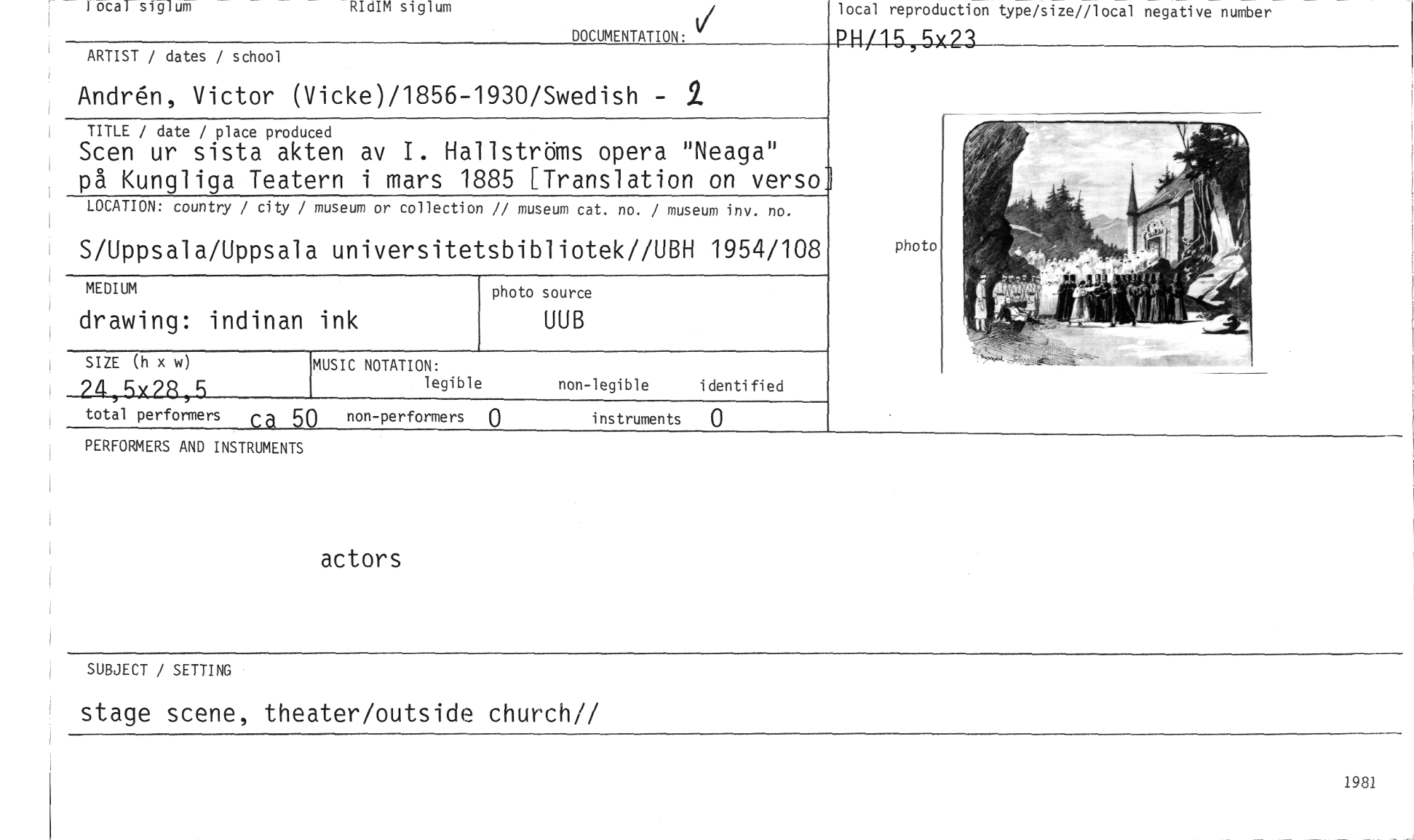 //// local reproduction type/size//local negative number //// PH/15,5x23 //// Andr&I, Victor (Vicke)/1856-1930/Swedish - 2 //// TITLE / date / place produced //// Scen ur sista akten av I. Hallströms opera "tveaga" //// på Kungliga Teatern i mars 1885 [Translation on versoi //// LOCATION: country / city / museum or collection // museum cat. no. / museum inv. no. //// S/Uppsala/Uppsala universitetsbibliotek//UBH 1954/108 //// photo source //// UUB //// SIZE (h x w) //// 24,x28,5 //// total performers ca 50 non-performers instruments 0 //// MEDIUM //// drawing: indinan ink //// MUSIC NOTATION: //// legible non-legible i denti fi ed //// I ocaT sigluffi RIdIM siglum //// DOCUMENTATION• //// ARTIST / dates / school //// photo //// PERFORMERS AND INSTRUMENTS //// actors //// SUBJECT / SETTING //// stage scene, theater/outside church// //// 1981 ////